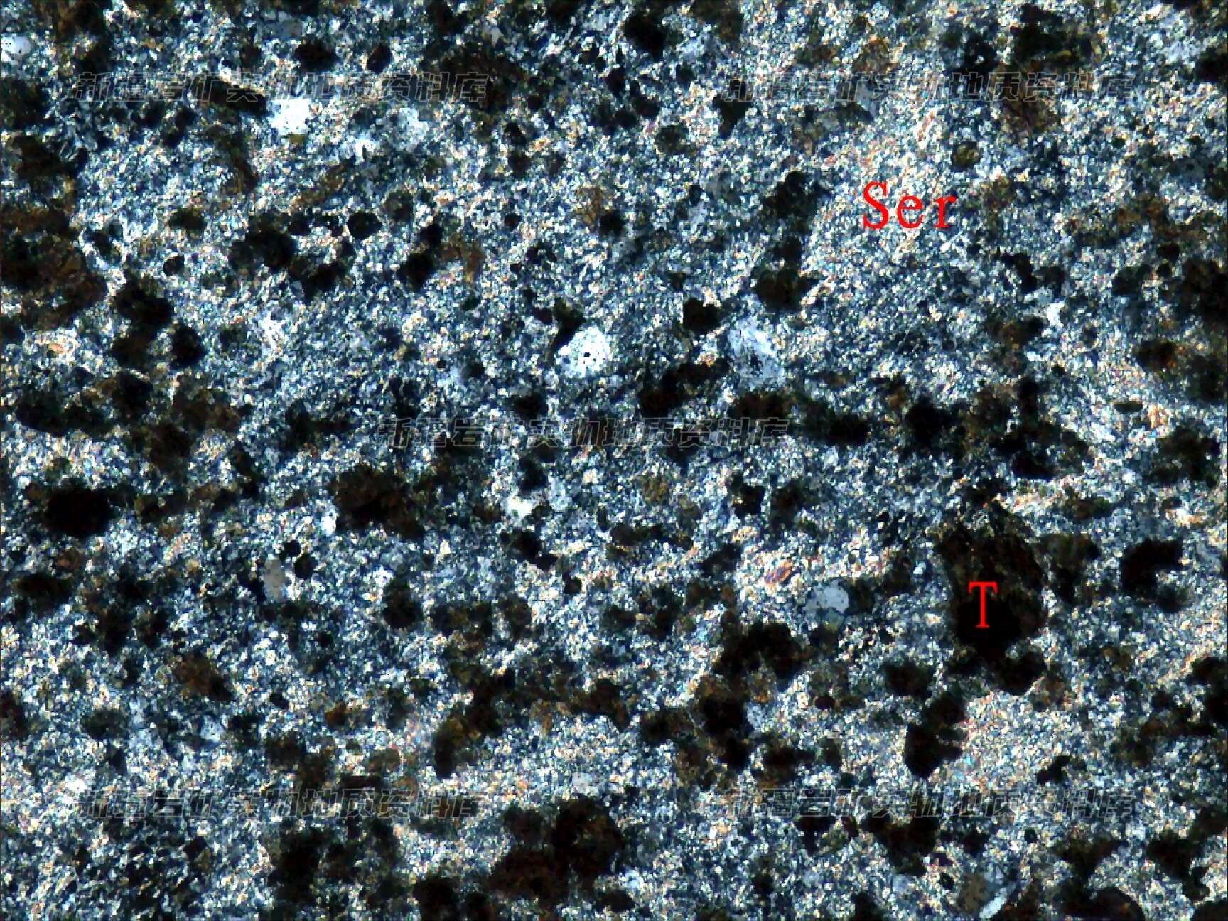 岩石特征描述: 岩石因强烈次生蚀变,原岩中矿物和结构已消失,仅见次生蚀变矿物电气石(T)、绢云母(Ser)和石英等。