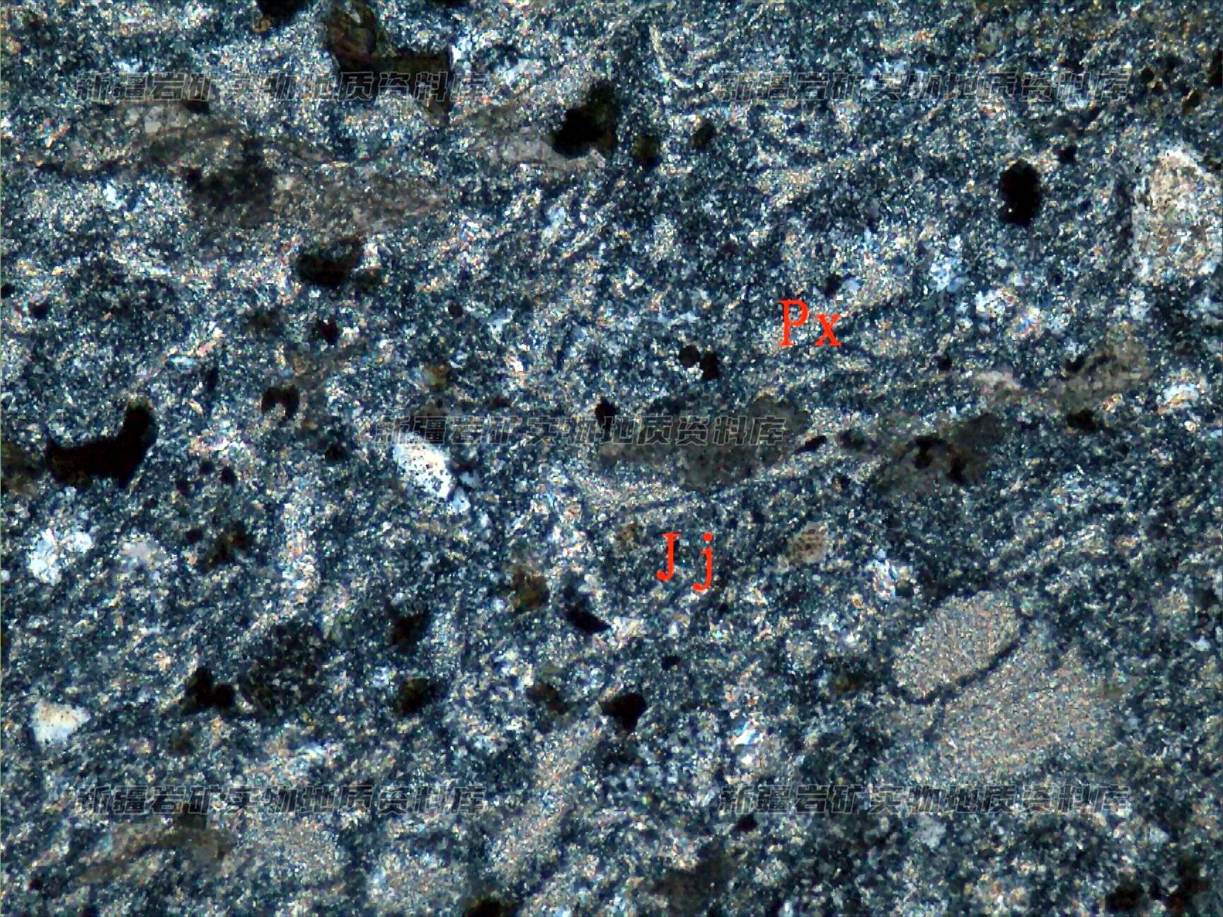 岩石特征描述: 主要成分为玻屑(P(+)),次有少量晶屑石英等,胶结物(Jj)已变为绢云母。