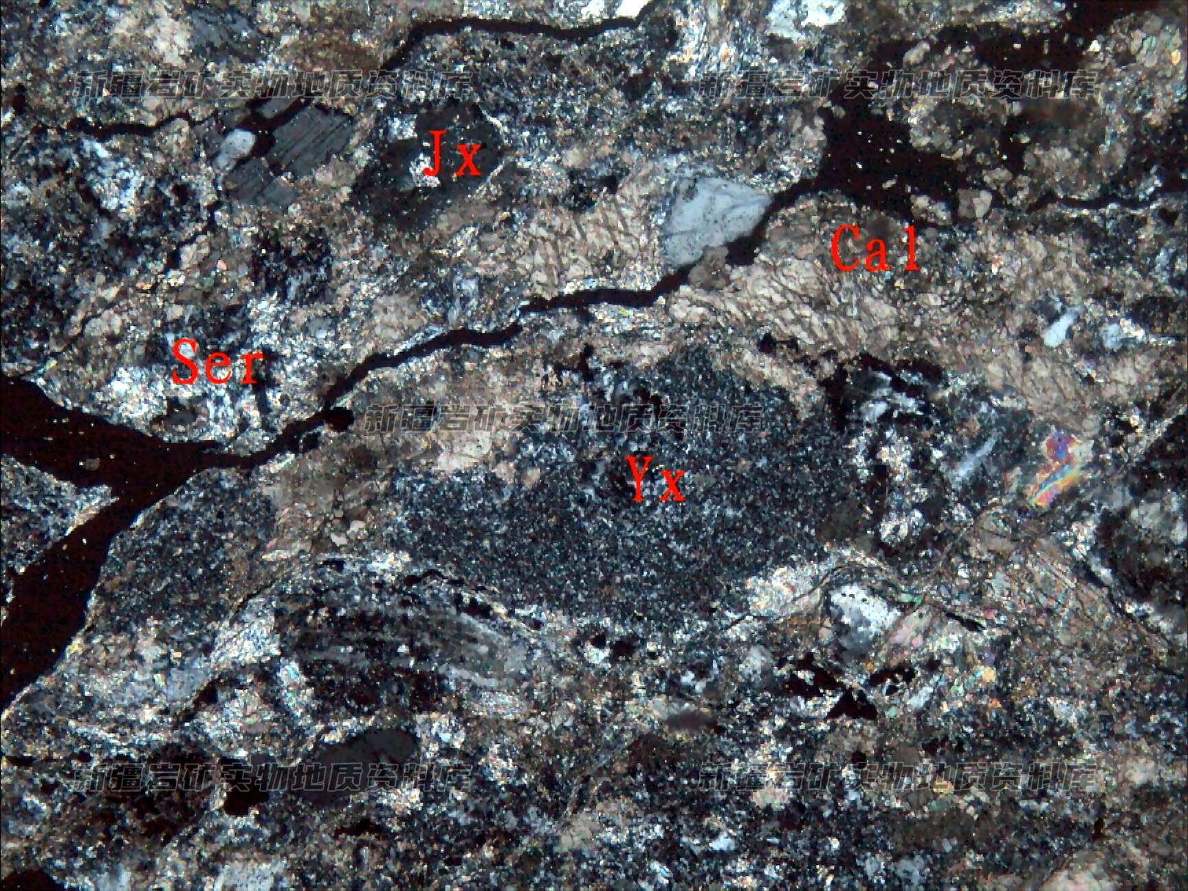 岩石特征描述: 岩石由岩屑(Y(+))、晶屑(J(+))及蚀变矿物方解石(Cal)、绢云母(Ser)等构成。
