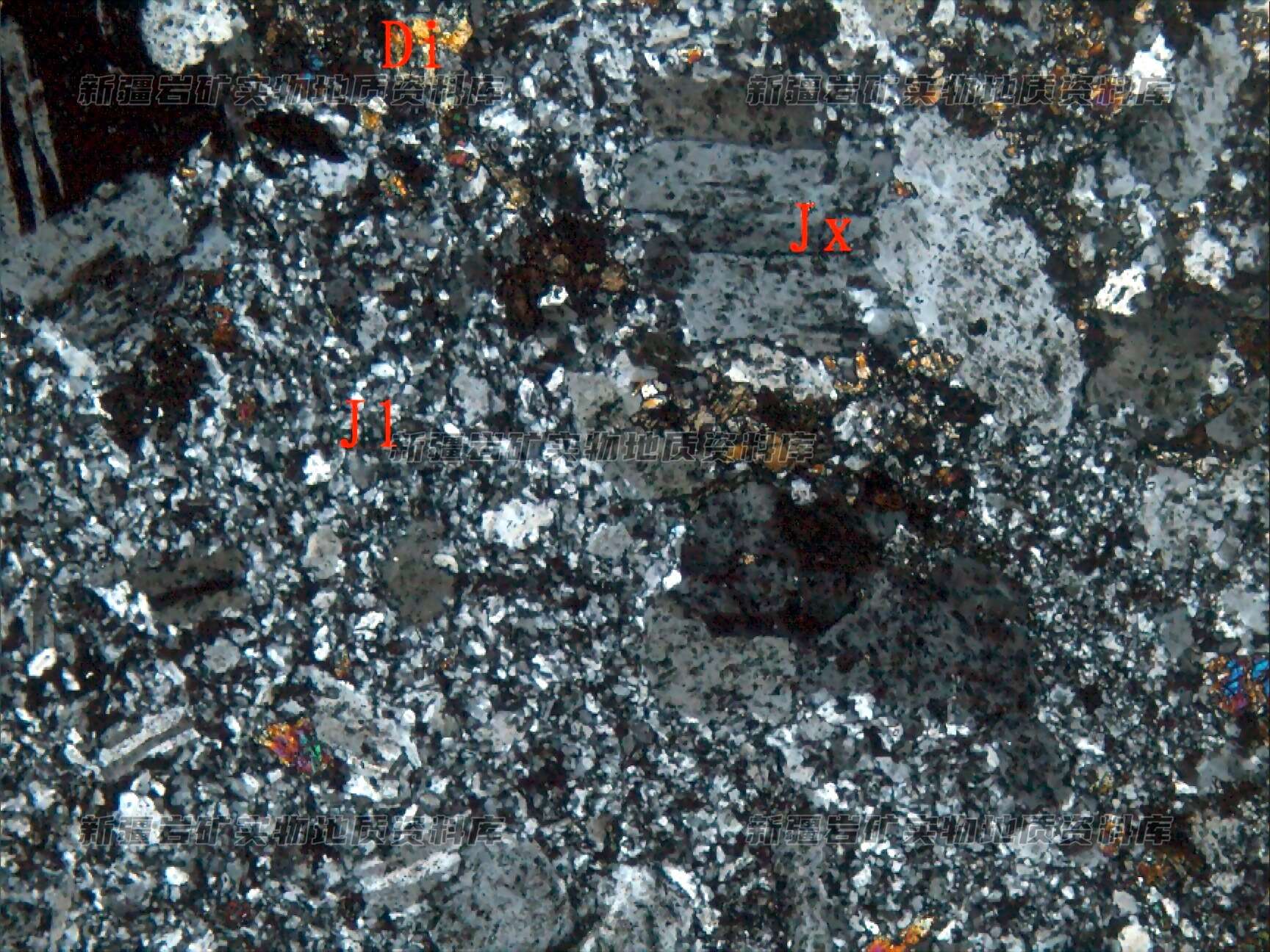 岩石特征描述: 岩石由角砾(Jl)、晶屑(J(+))斜长石及胶结物等构成,胶结物已变为透辉石、黝帘石等。
