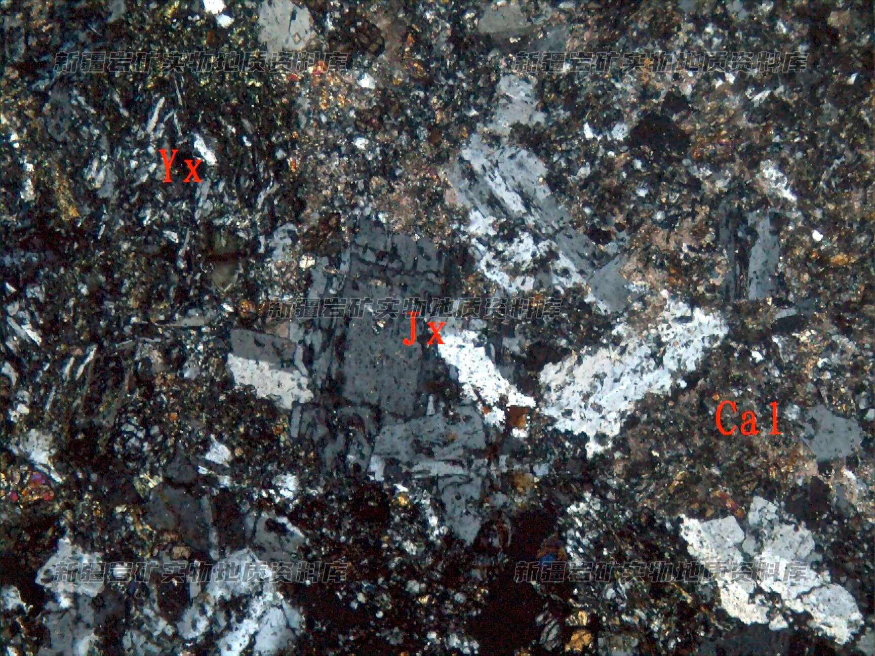 岩石特征描述: 岩石由岩屑(Y(+))、晶屑(J(+))斜长石及胶结物构成,叠加方解石(Cal)化,透辉石化及帘石化。