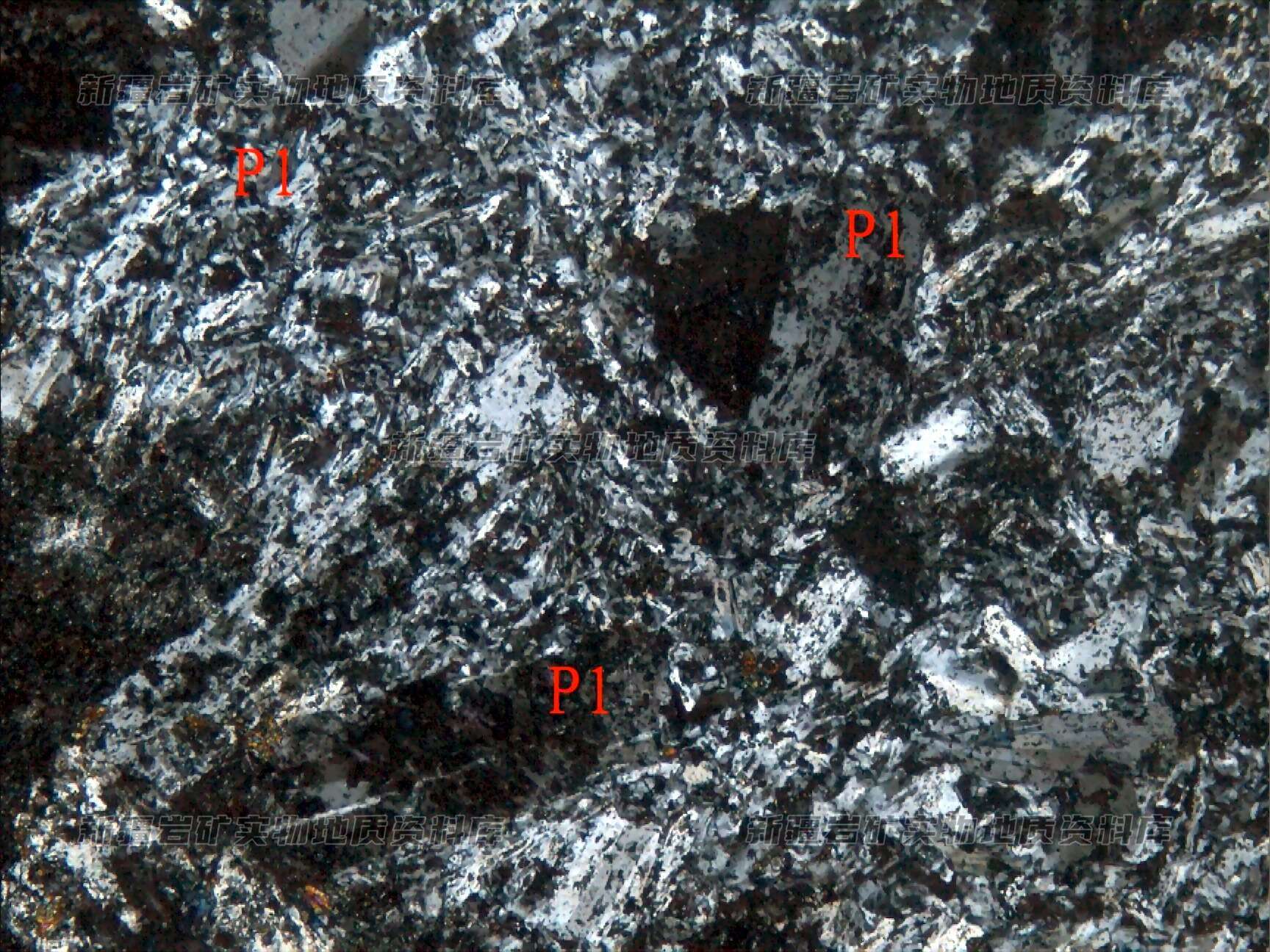 基质由微板条状斜长石为主组成,斜长石蚀变同斑晶,在斜长石之间分布蚀变绿泥石(绿泥石呈微柱状、长柱状,应为角闪石外形),另外分布少量榍石,呈他形微晶粒状,个别的较粗的呈菱面体状,较均匀分布斜长石之间。