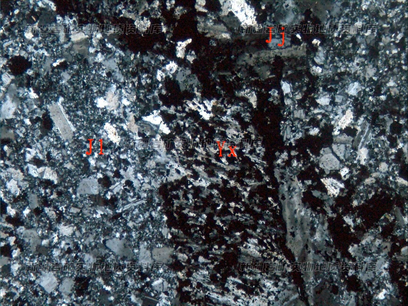 岩石特征描述: 由火山角砾(Jl)、岩屑(Y(+))及胶结物(Jj)等构成,并叠加磁铁矿化。