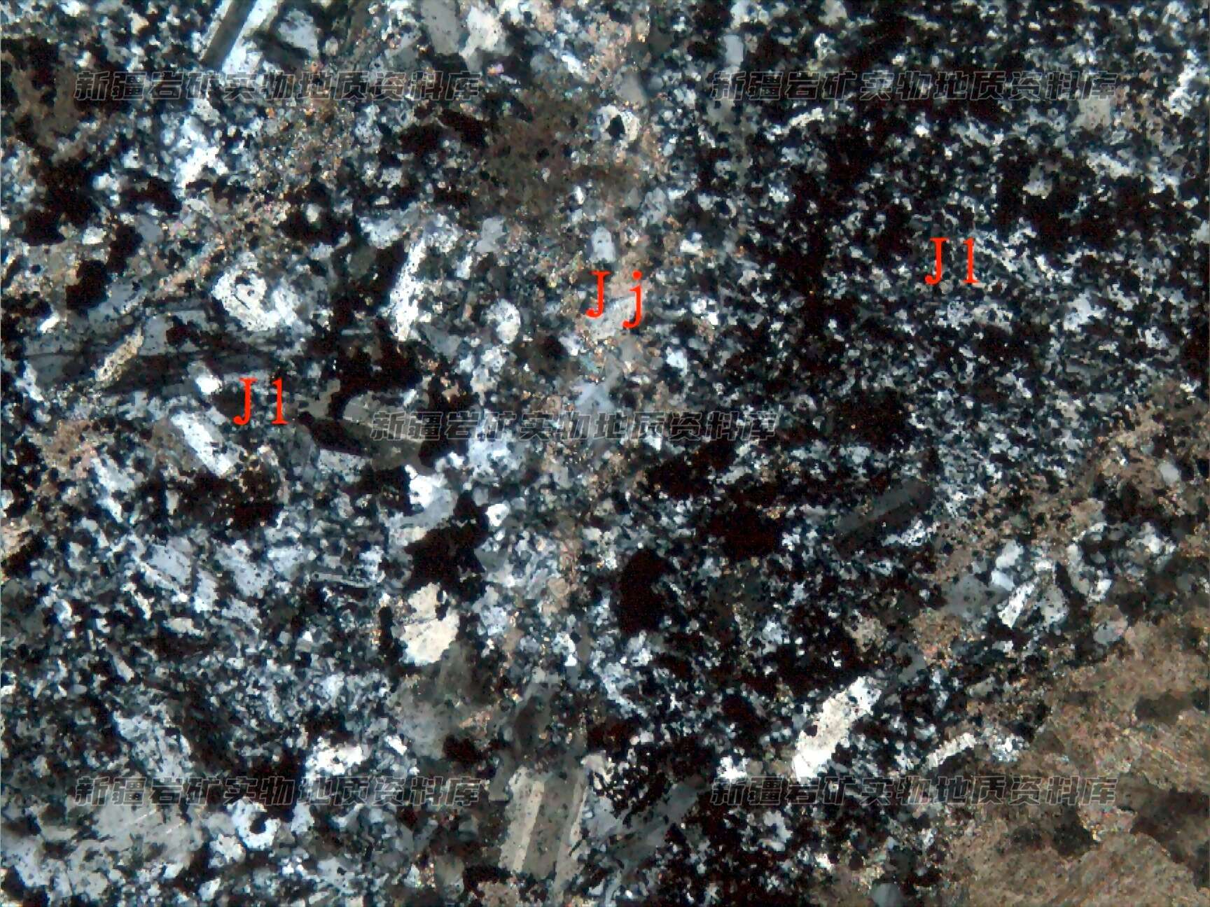 岩石特征描述: 由火山角砾(Jl)及胶结物(Jj)构成,并叠加磁铁矿化。
