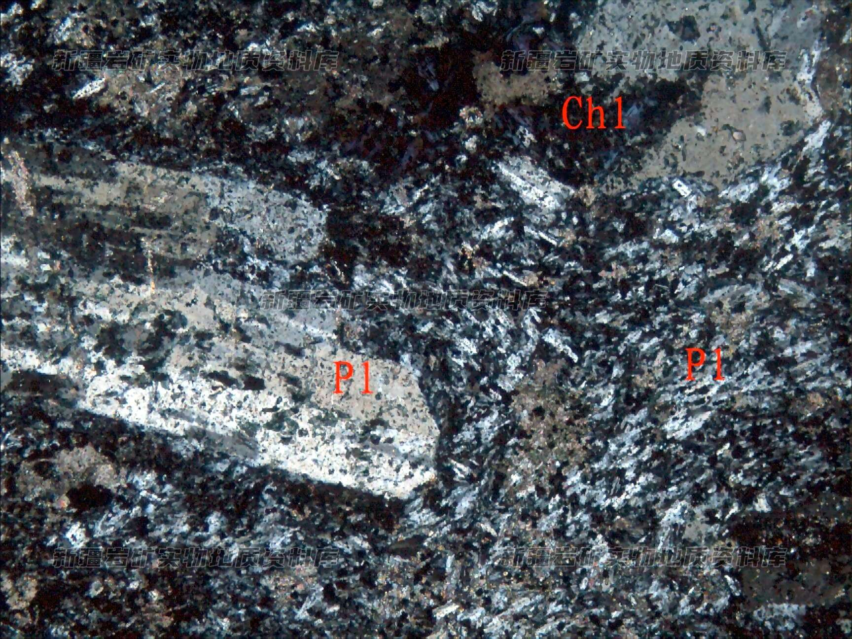 岩石特征描述: 斑晶为斜长石(Pl),呈半自形粒状分布,基质为板条状微晶斜长石(Pl)及绿泥石(Chl)等构成。