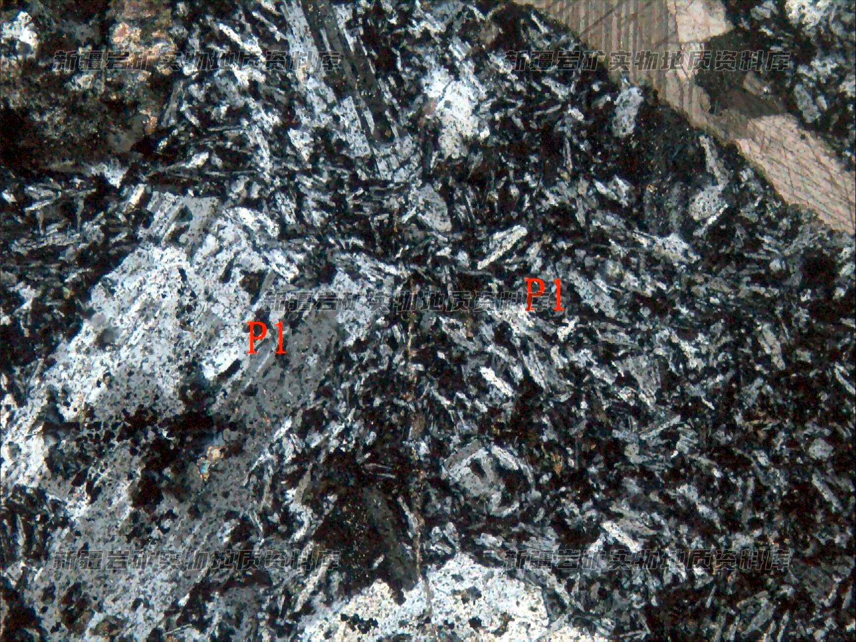 岩石特征描述: 斑晶为斜长石(Pl),呈半自形粒状分布,基质由板条状微晶斜长石(Pl)及绿泥石等构成。
