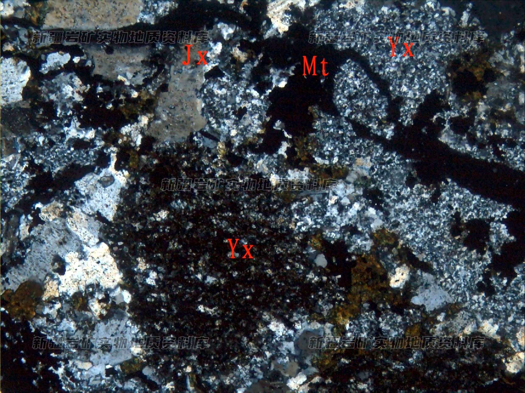 岩石特征描述: 岩石由岩屑(Y(+))、晶屑(J(+))及胶结物构成,叠加绿泥石化和磁铁矿化(Mt)。