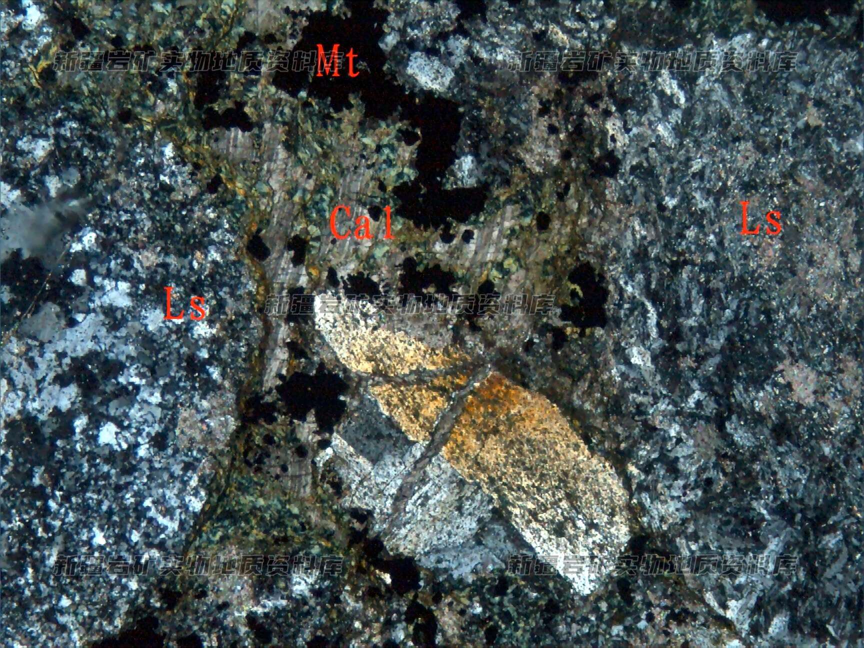 岩石特征描述: 岩石由砾石(Ls)及胶结物构成,并叠加磁铁矿(Mt)化及方解石(Cal)化。