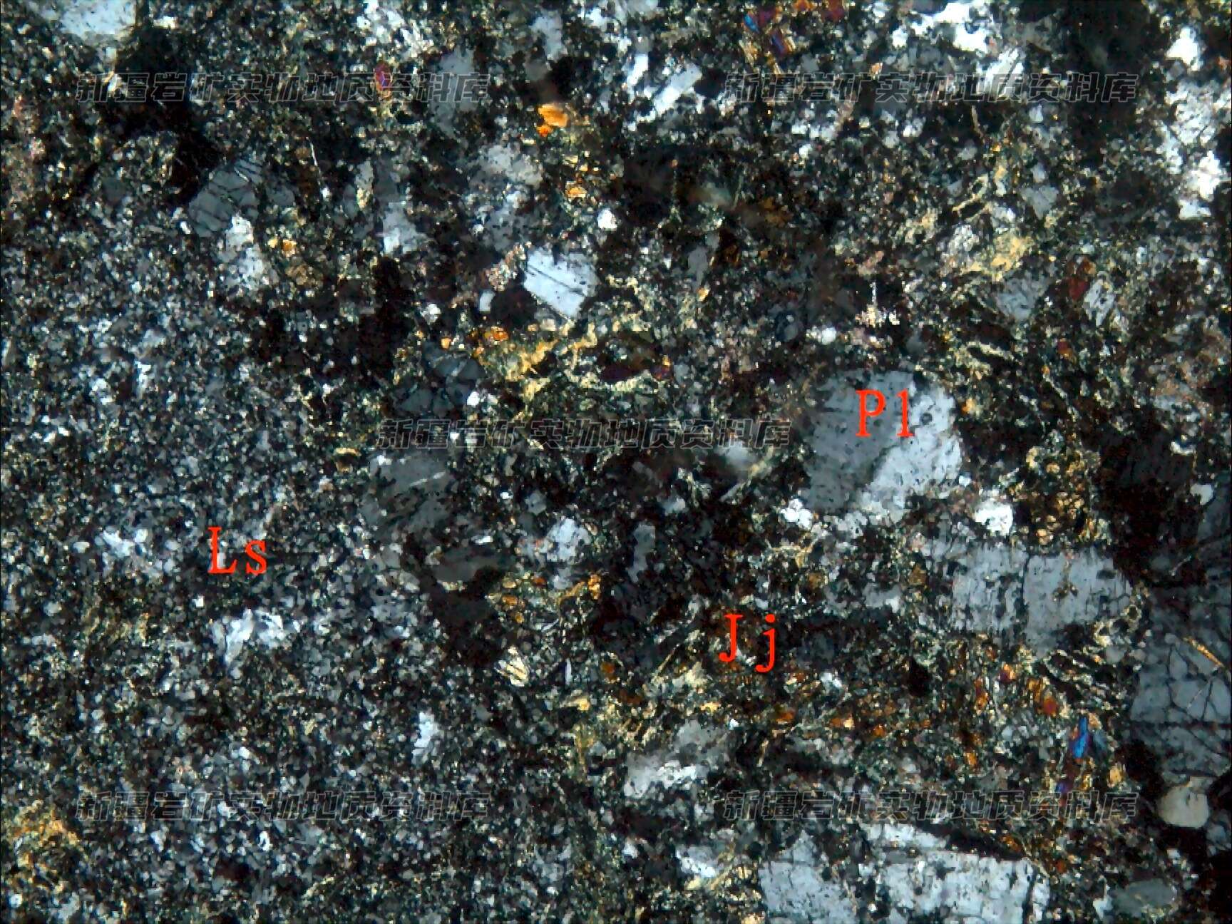 岩石特征描述: 岩石由砾石(Ls)和晶屑斜长石(Pl)及胶结物(Jj)等构成,胶结物为绿泥石等。