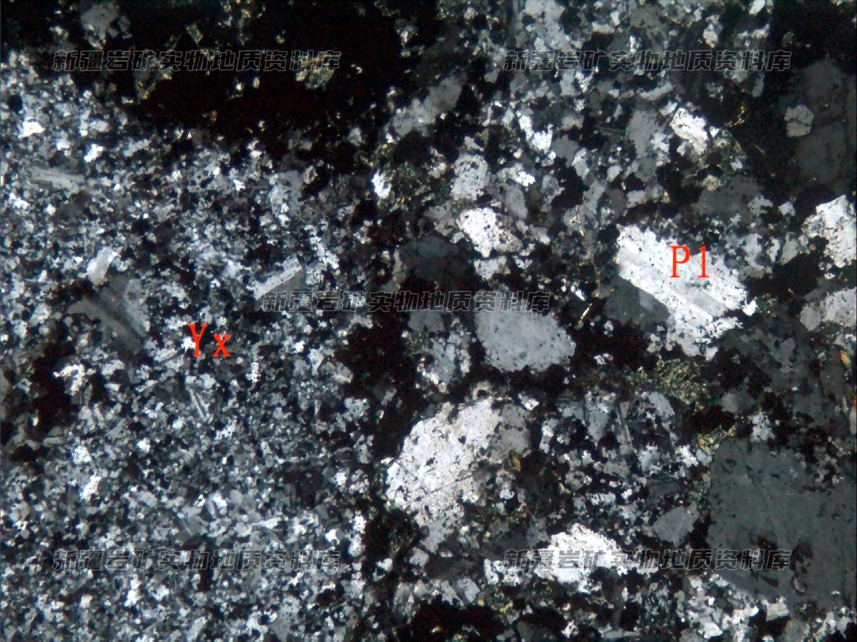 岩石特征描述: 岩石由岩屑(Y(+))、晶屑斜长石(Pl)及胶结物构成,并叠加磁铁矿化。