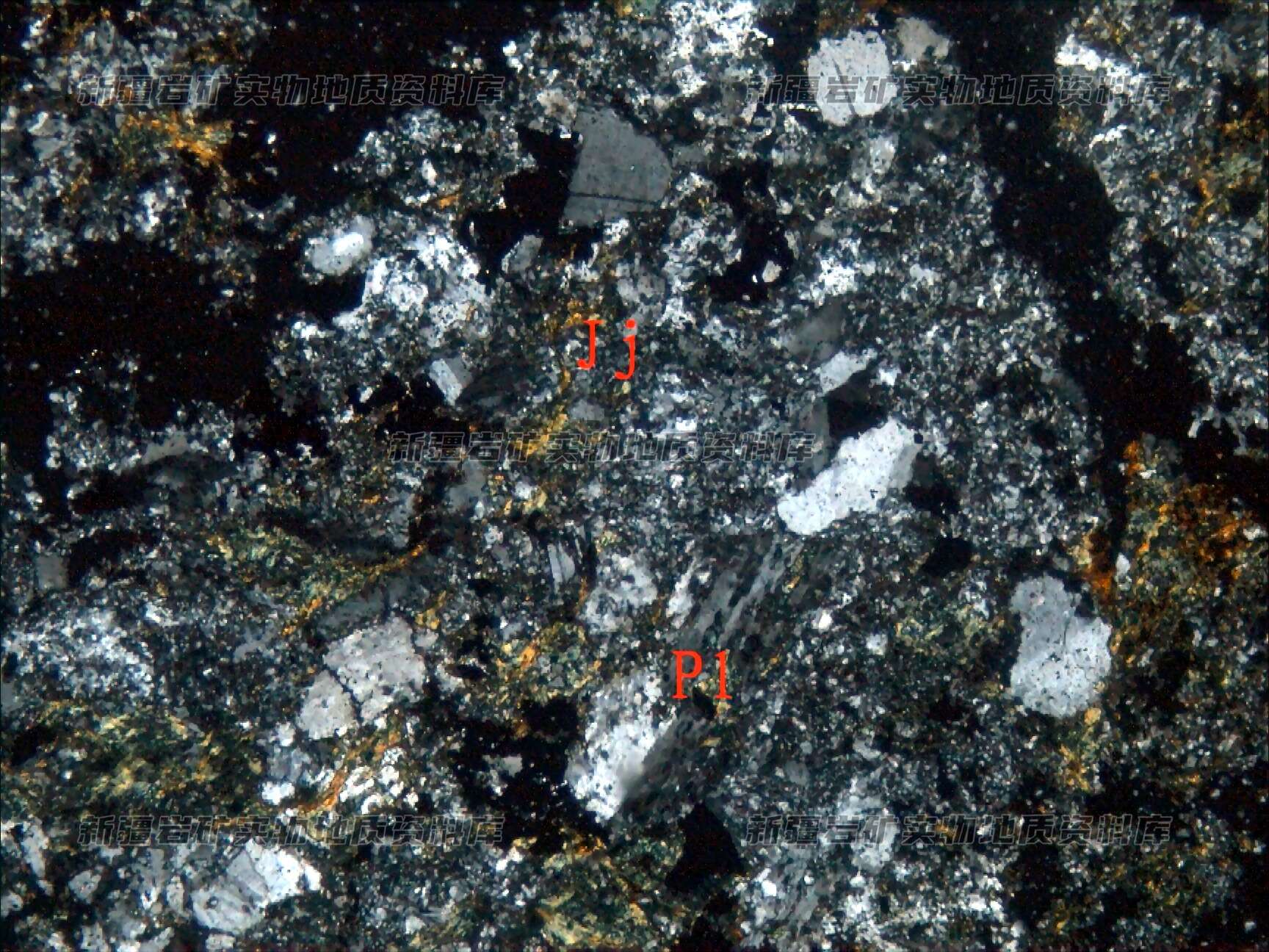 岩石特征描述: 岩石由岩屑、长石(Pl)碎屑及胶结物(Jj)构成,次生蚀变强,为磁铁矿化、绿泥石化。