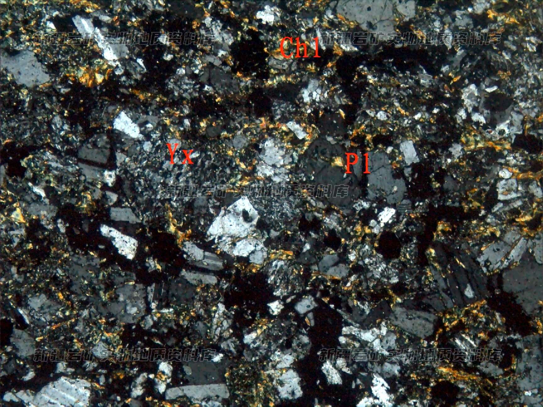 岩石特征描述: 岩石由岩屑(Y(+))、长石(Pl)碎屑及胶结物绿泥石(Chl)等构成。