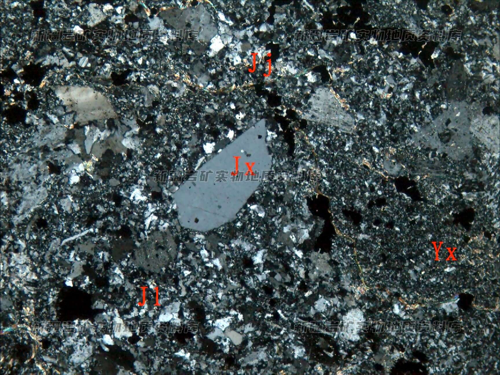 岩石特征描述: 岩石由角砾(Jl)、晶屑(J(+))及胶结物(Jj)构成,胶结物为长英质及绢云母。