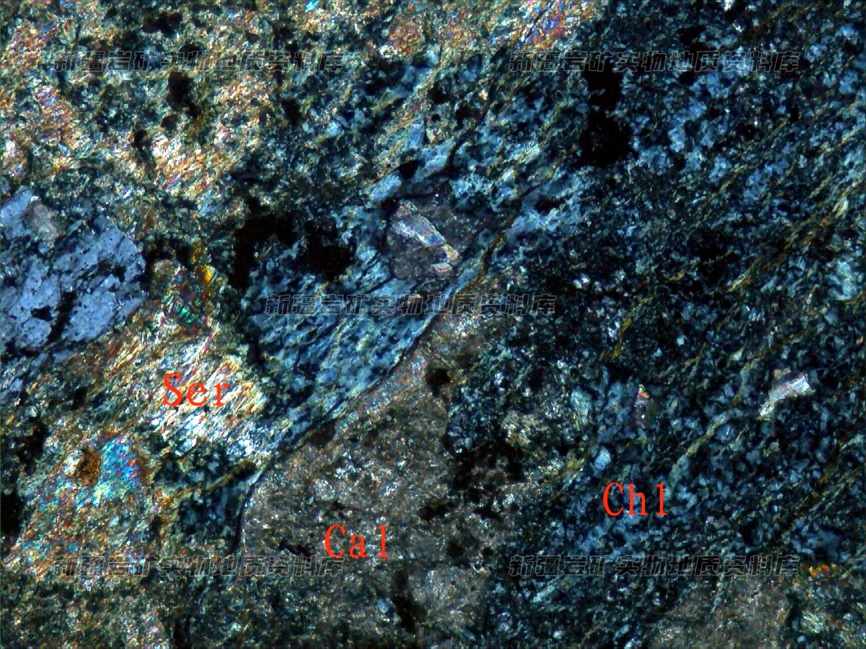岩石特征描述: 岩石中的矿物已全部被次生蚀变矿物绿泥石(Chl)、方解石(Cal)及绢云母(Ser)构成,原岩中的矿物已消失。