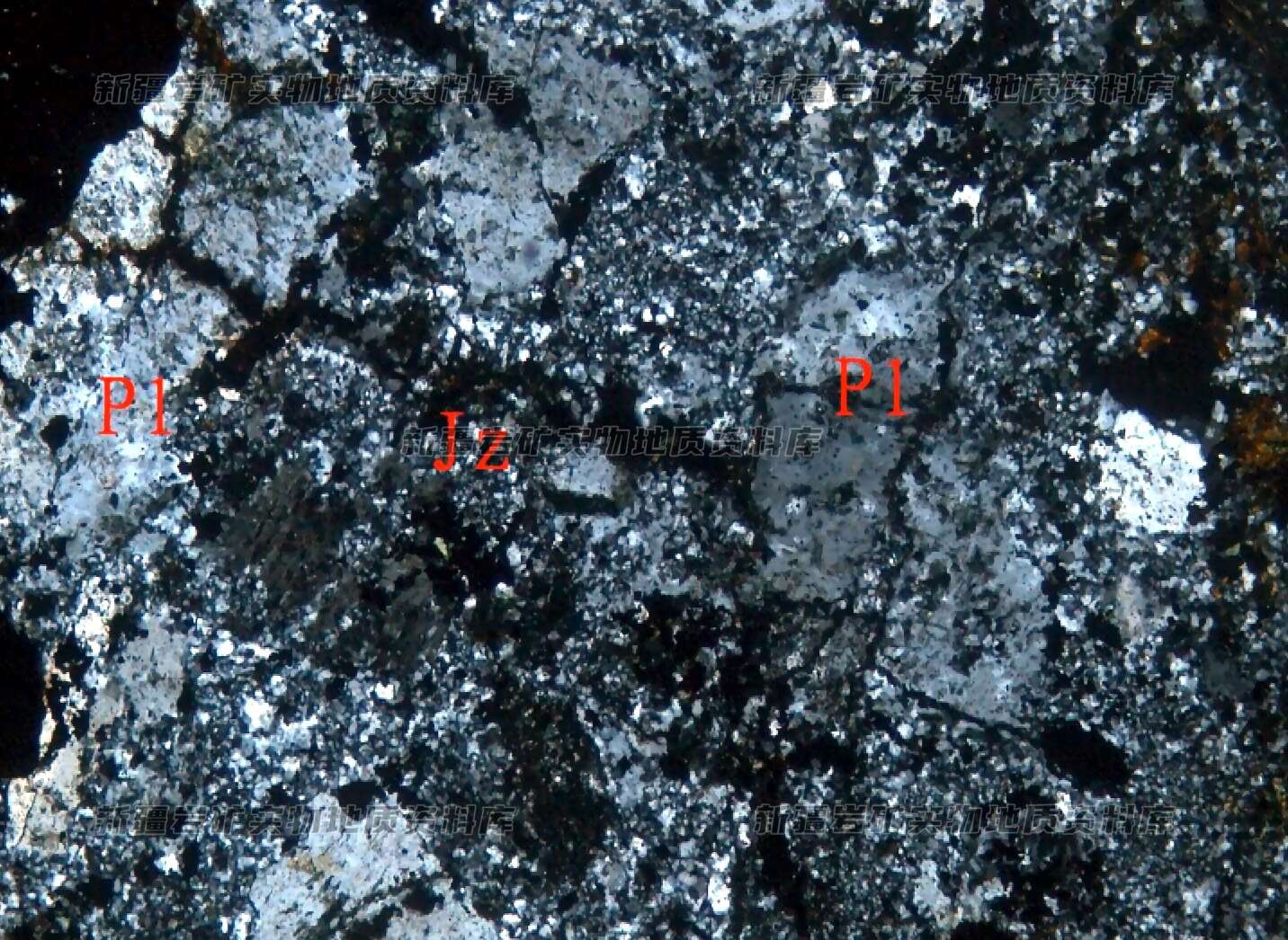 岩石特征描述: 岩石受应力活动影响,产生破碎,沿裂隙充填磁铁矿(Mt),其余由斑晶斜长石(Pl)和基质(Jz)构成。