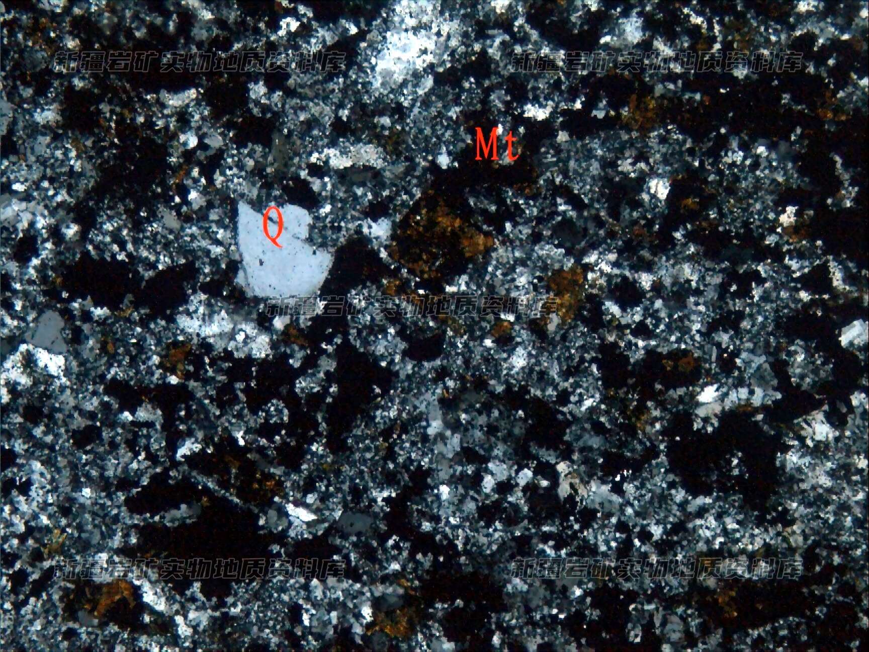 岩石特征描述: 岩石已全部被次生蚀变长英质矿物、绿泥石及磁铁矿(Mt)取代,仅保留少量的石英(Q)。