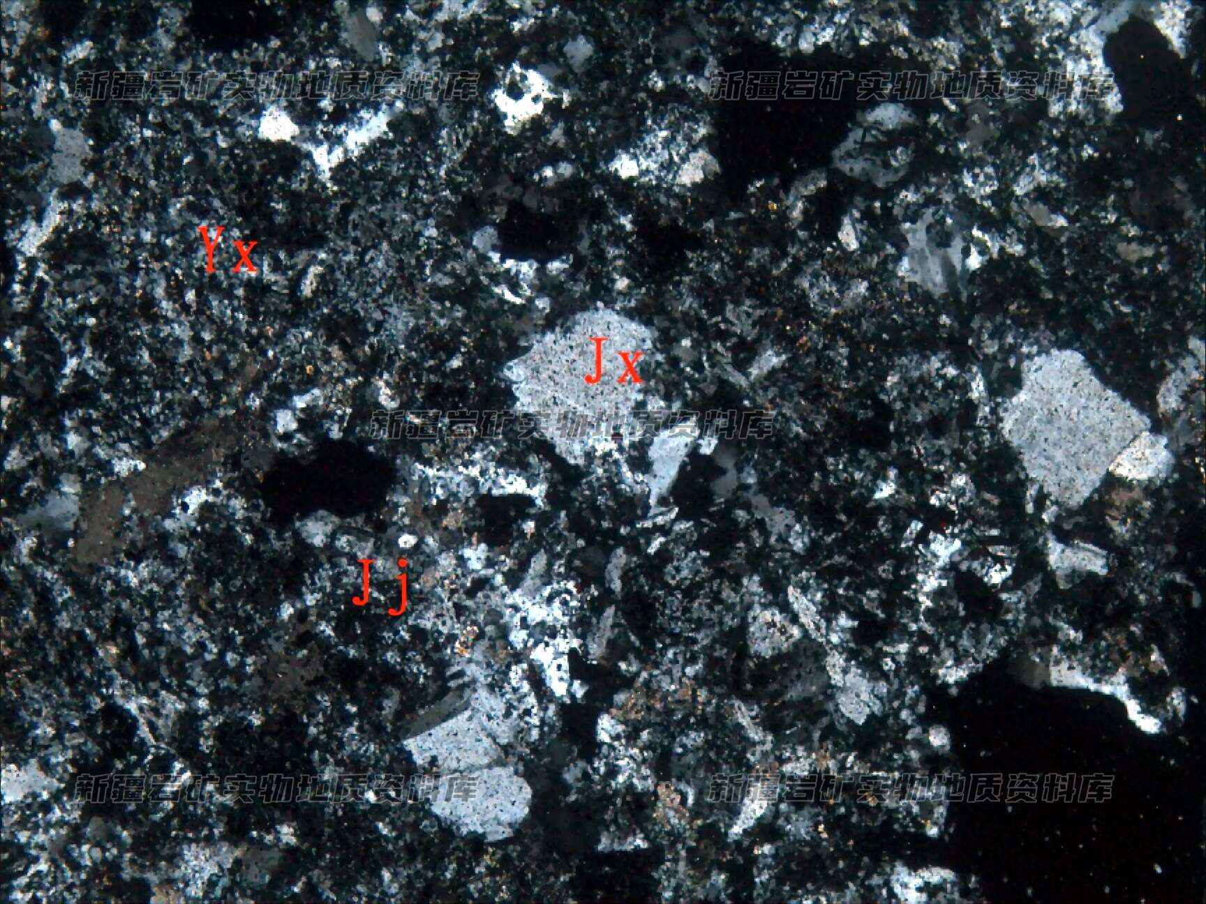 岩石特征描述: 岩石由岩屑(Y(+))、晶屑(J(+))及胶结物(Jj)构成,胶结物为长英质和绿泥石集合体。