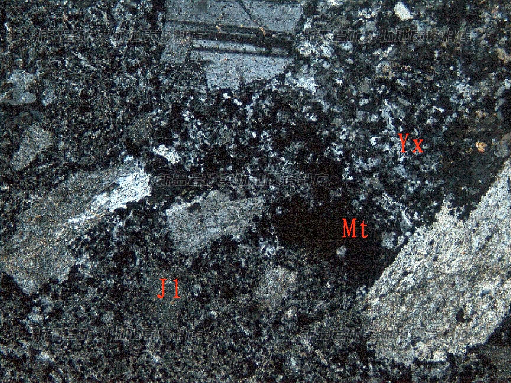 岩石特征描述: 岩石由火山角砾(Jl)、岩屑(Y(+))、晶屑及胶结物构成,叠加磁铁矿(Mt)化。