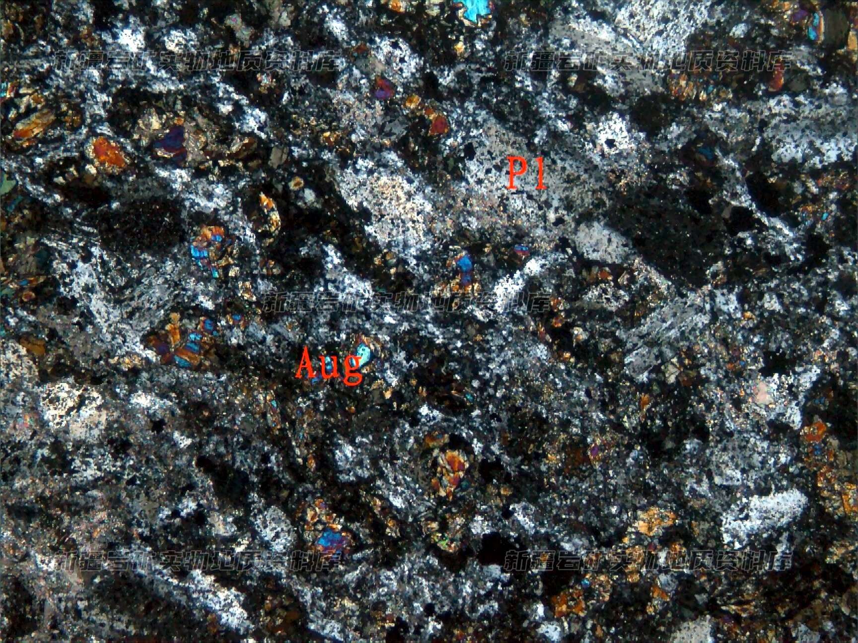 主要矿物及含量%: 斜长石69,辉石30,不透明矿物少-1
