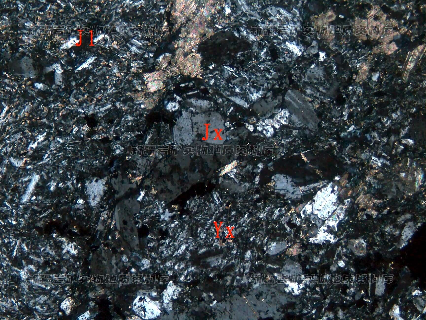 岩石特征描述: 岩石由火山角砾(Jl)、岩屑(Y(+))、晶屑斜长石(Pl)及胶结物构成。