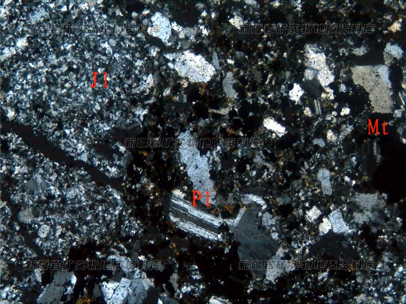 岩石特征描述: 岩石由角砾(J(+))、晶屑斜长石(Pl)和胶结物构成,并叠加磁铁矿(Mt)化。