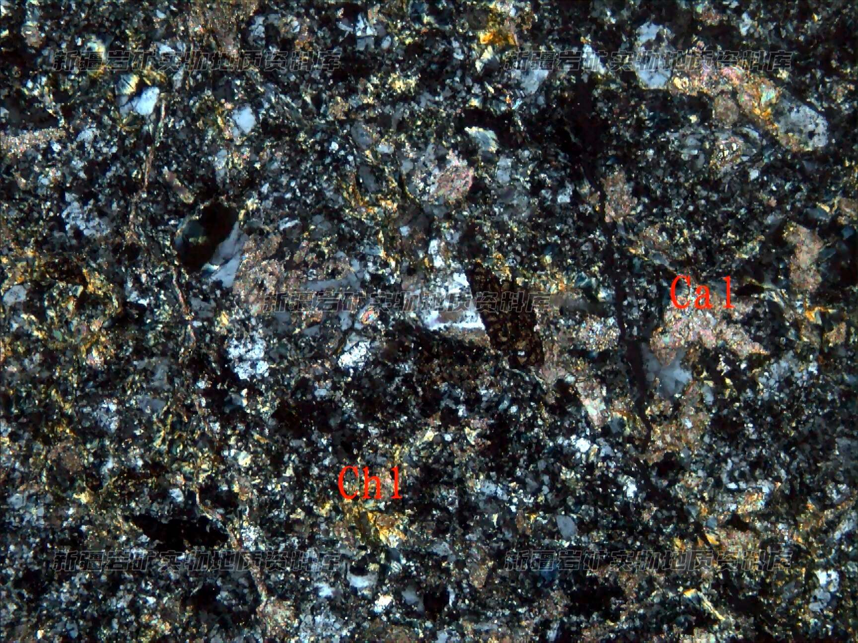 岩石特征描述: 岩石已完全被次生蚀变矿物绿泥石(Chl)、方解石(Cal)等取代,原岩中矿物及结构已变的模糊不清。