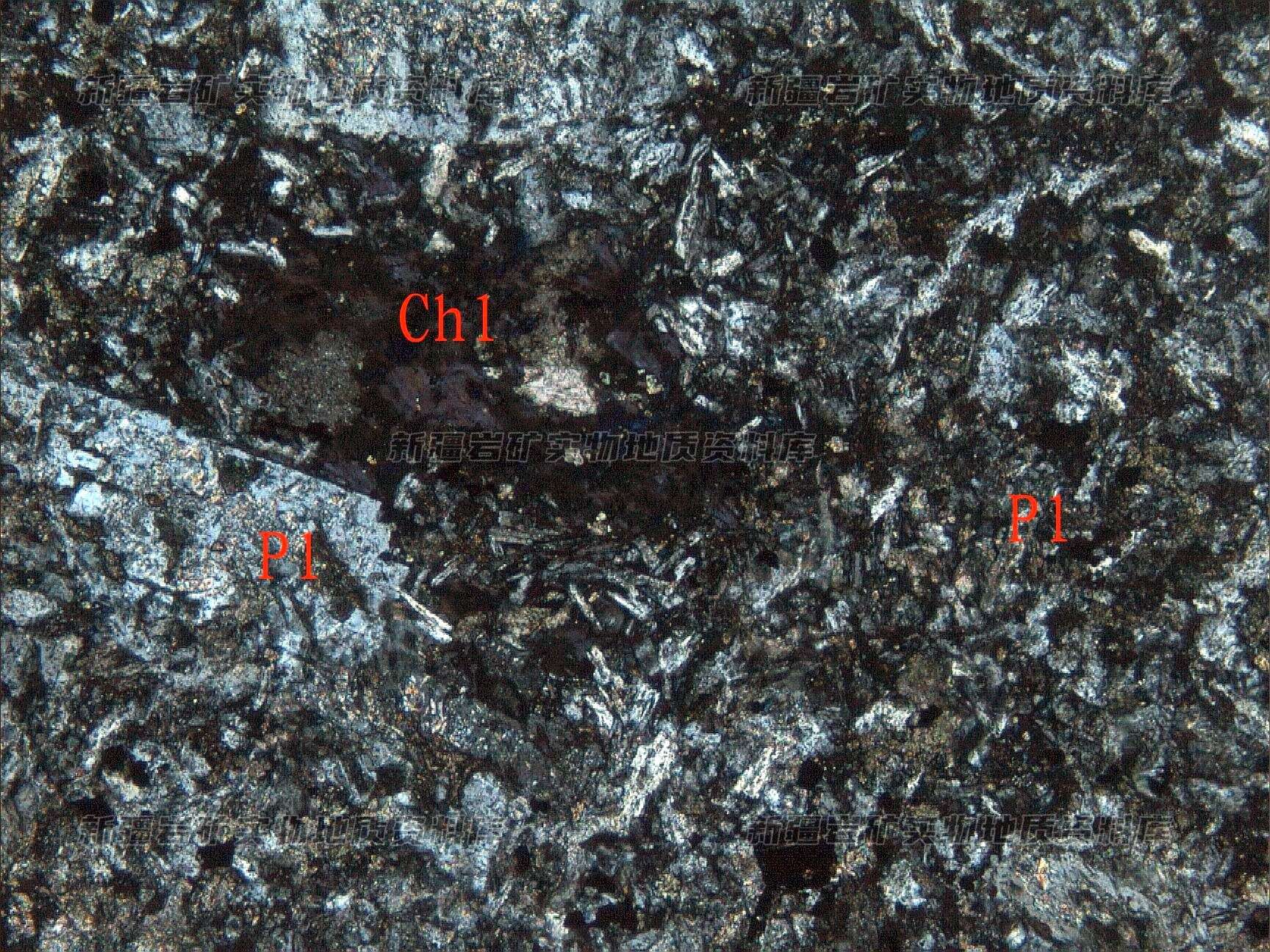 岩石特征描述: 斑晶为斜长石(Pl)和暗色矿物,后者已蚀变为绿泥石(Chl),基质板条状微晶斜长石(Pl)杂乱分布,其间分布绿泥石等。