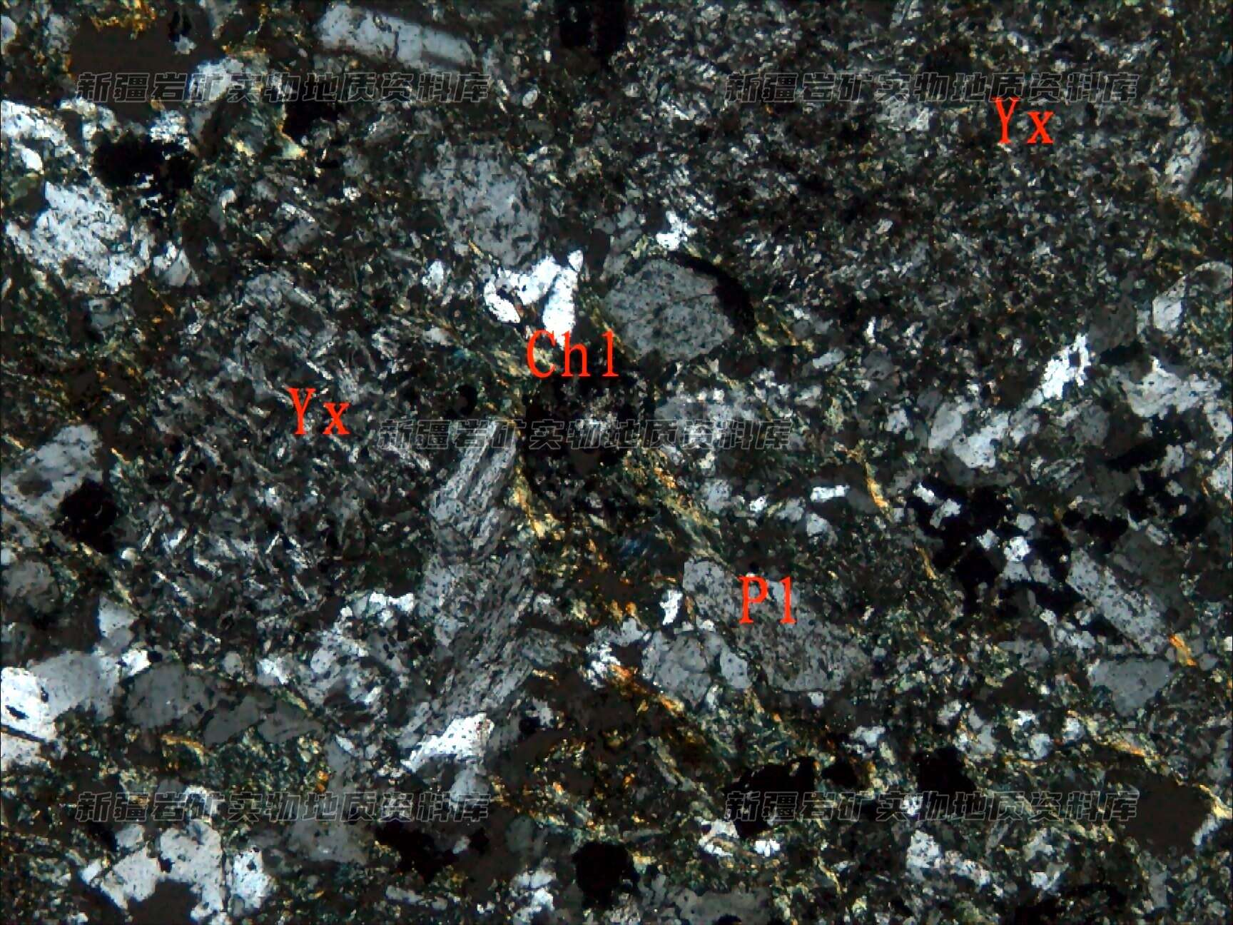 岩石特征描述: 岩石由岩屑(Y(+))、晶屑斜长石(Pl)及胶结物绿泥石(Chl)。