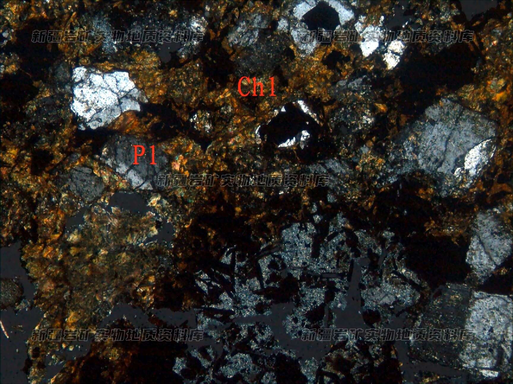 岩石特征描述: 岩石已强烈蚀变,仅保留一部分晶屑斜长石(Pl),其余为铁染的绿泥石(Chl)。