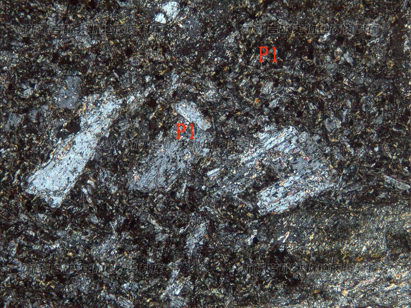 岩石特征描述: 斑晶为斜长石(Pl),呈半自形粒状-板状,基质由板条状微晶斜长石(Pl)、磁铁矿及绿泥石构成,长石已绢云母化。