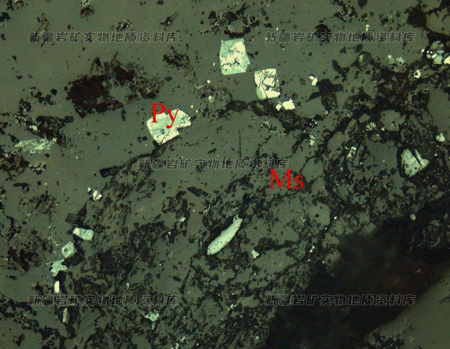 岩石特征描述: 金属硫化物黄铁矿(Py)呈自形-半自形粒状星散分布,被褐铁矿沿边缘交代。