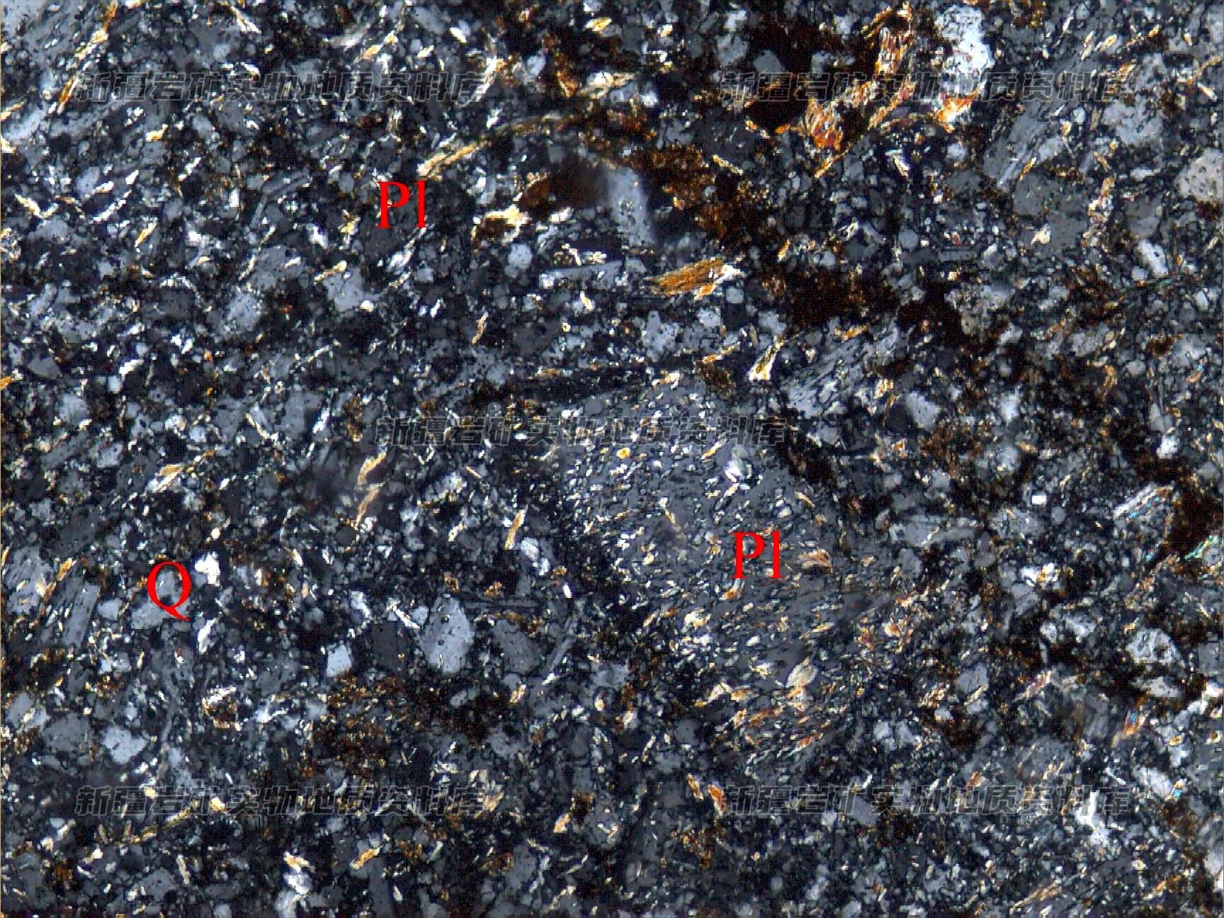 岩石特征描述: 斑状结构,斑晶为斜长石(Pl),含量低,呈半自形粒状、板状分布,被绢云母交代,基质由细粒的斜长石(Pl)、石英(Q)及白云母等构成。