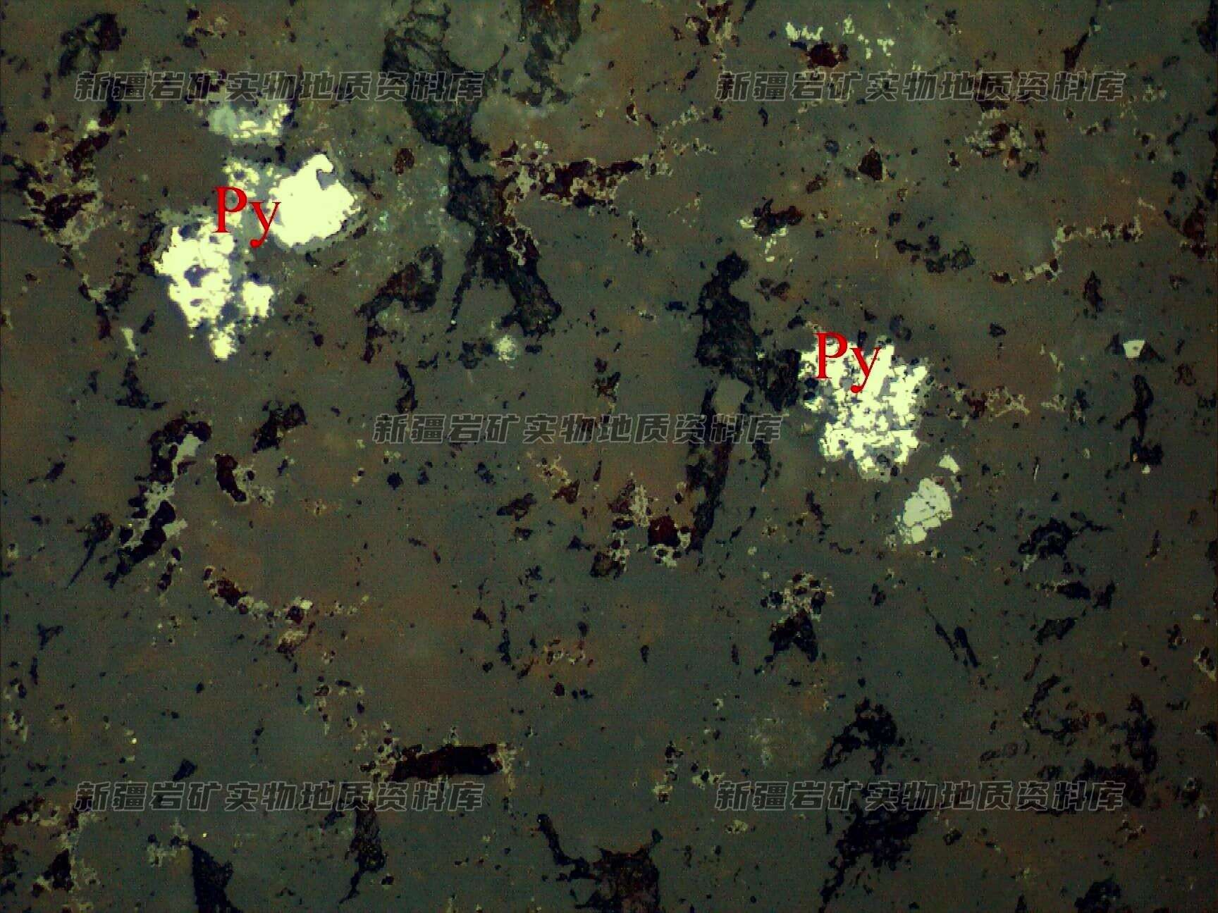 岩石特征描述: 黄铁矿(Py)半自形-他形粒状,呈星点状分布,被褐铁矿沿边缘交代