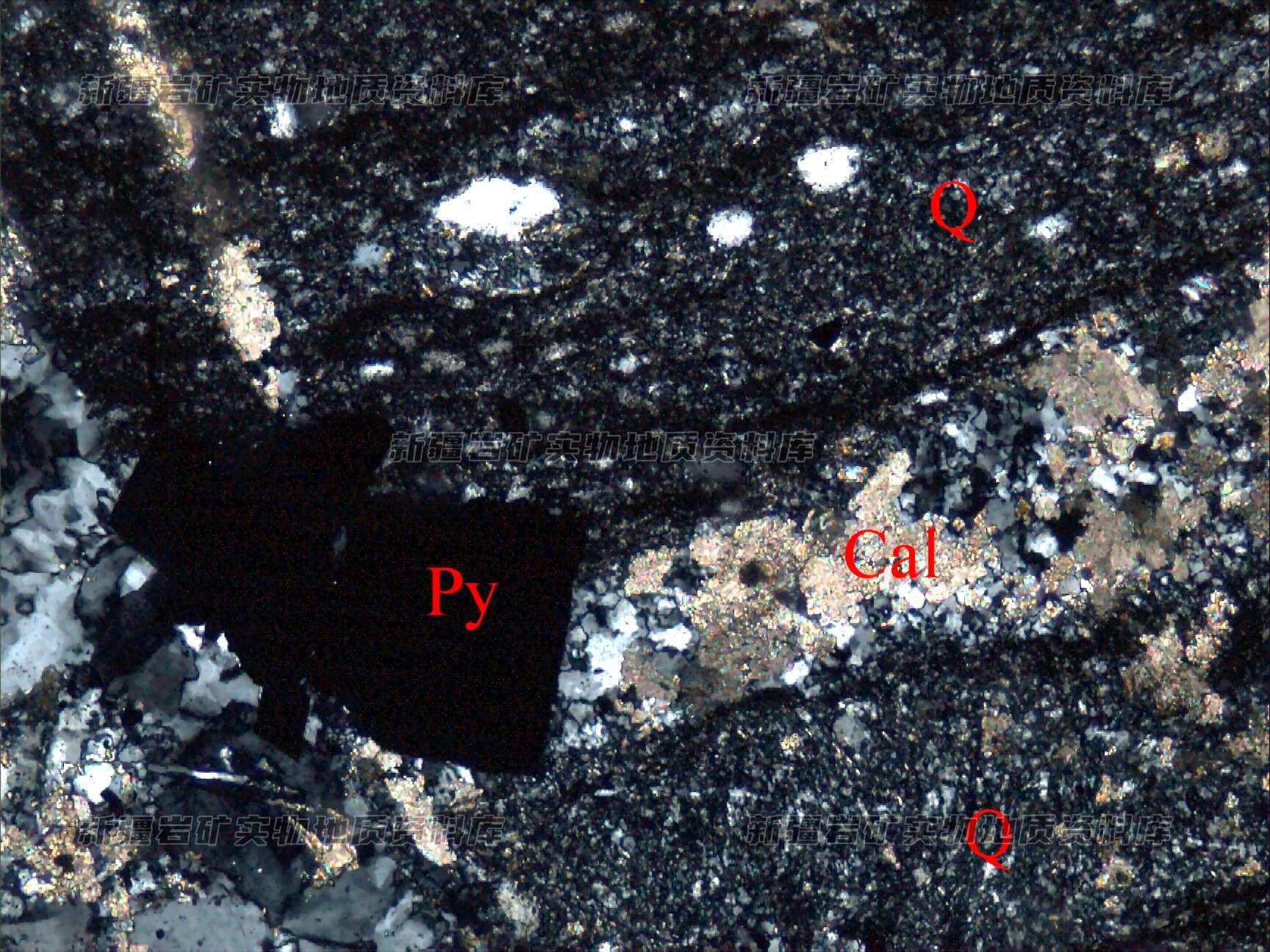 岩石特征描述: 金属硫化物为黄铁矿(Py)、毒砂(Ars),自形-半自形粒状,呈浸染条带状或星散状分布。