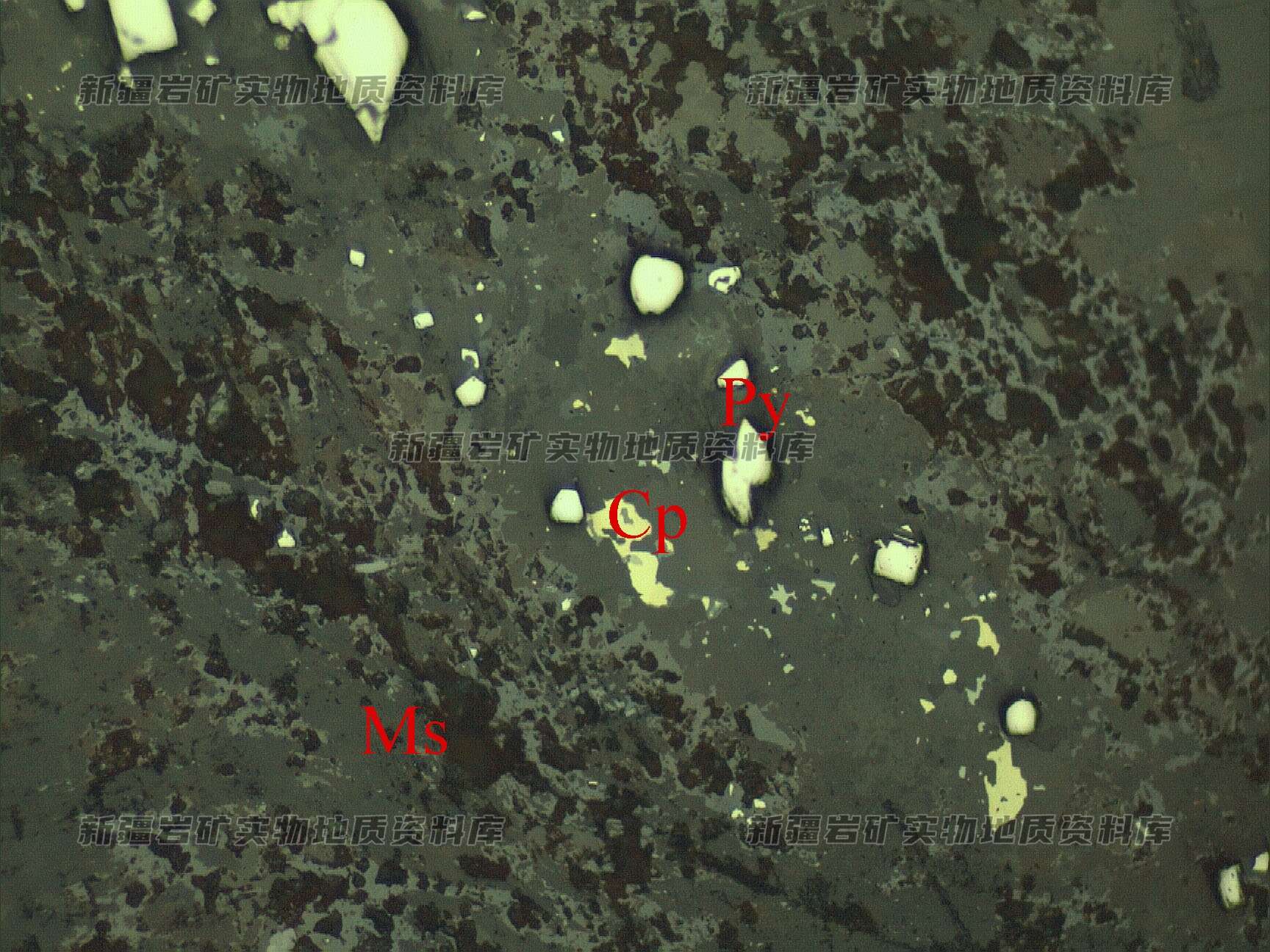 岩石特征描述: 金属硫化物黄铁矿(Py)、黄铜矿(Cp),呈自形-他形粒状,沿裂隙呈串珠状分布在脉石矿物(Ms)中。