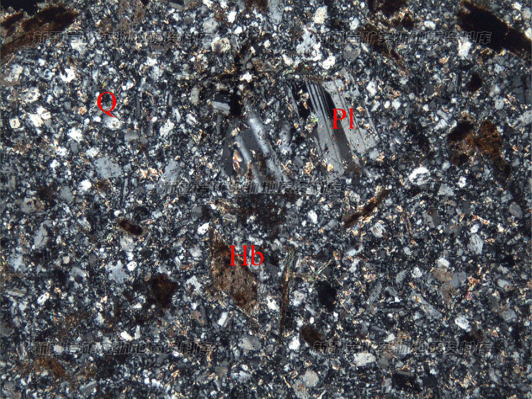 基质由细粒斜长石、钾长石、石英集合体,粒径在0.03-0.2mm±。斜长石为钠长石-更长石,半自形-他形粒状,钾长石为正长石,他形粒状,含量低,石英粒细,分布在长石之间。