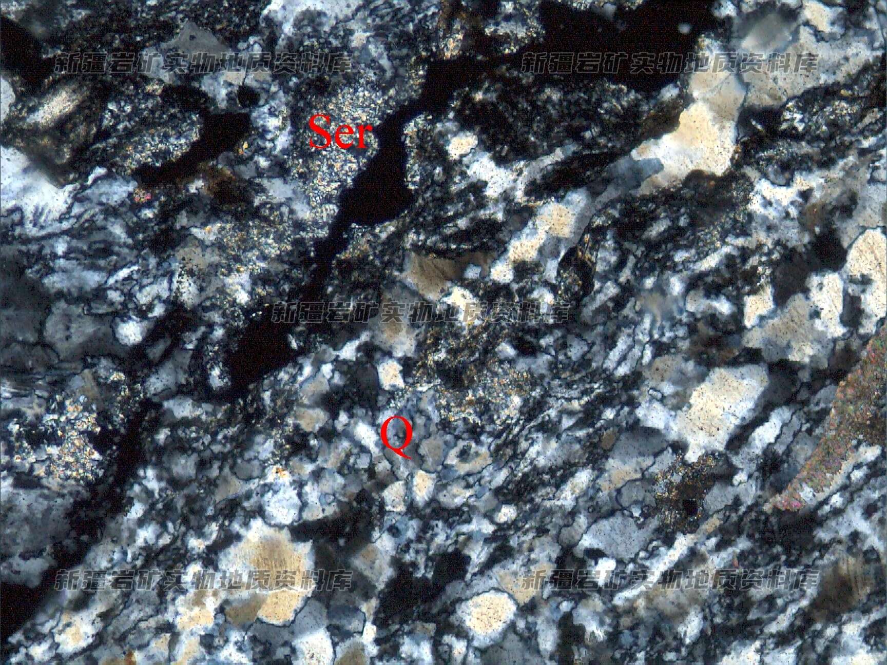 岩石特征描述: 他形粒状结构,由石英(Q)、少量的绢云母(Ser)等构成,石英具定向分布