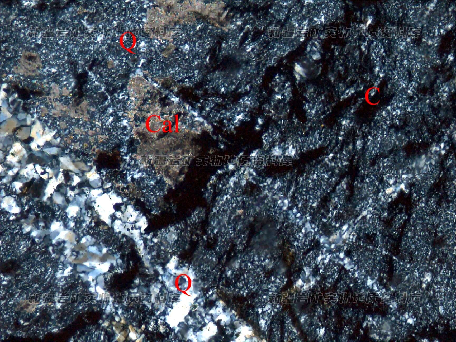 岩石特征描述: 隐晶质-他形粒状结构,岩石由细粒-微晶状的石英(Q)集合体构成,其中含有一些炭质(C)、方解石(Cal),沿裂隙充填石英脉(Q)。