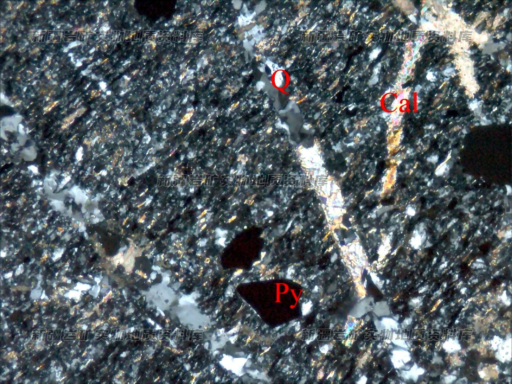 岩石特征描述: 粉砂状结构,岩石由长石、石英粉砂屑及胶结物构成,受应力作用影响,岩石被压碎,并叠加黄铁矿(Py),沿裂隙充填方解石(Cal)脉和石英(Q)脉。