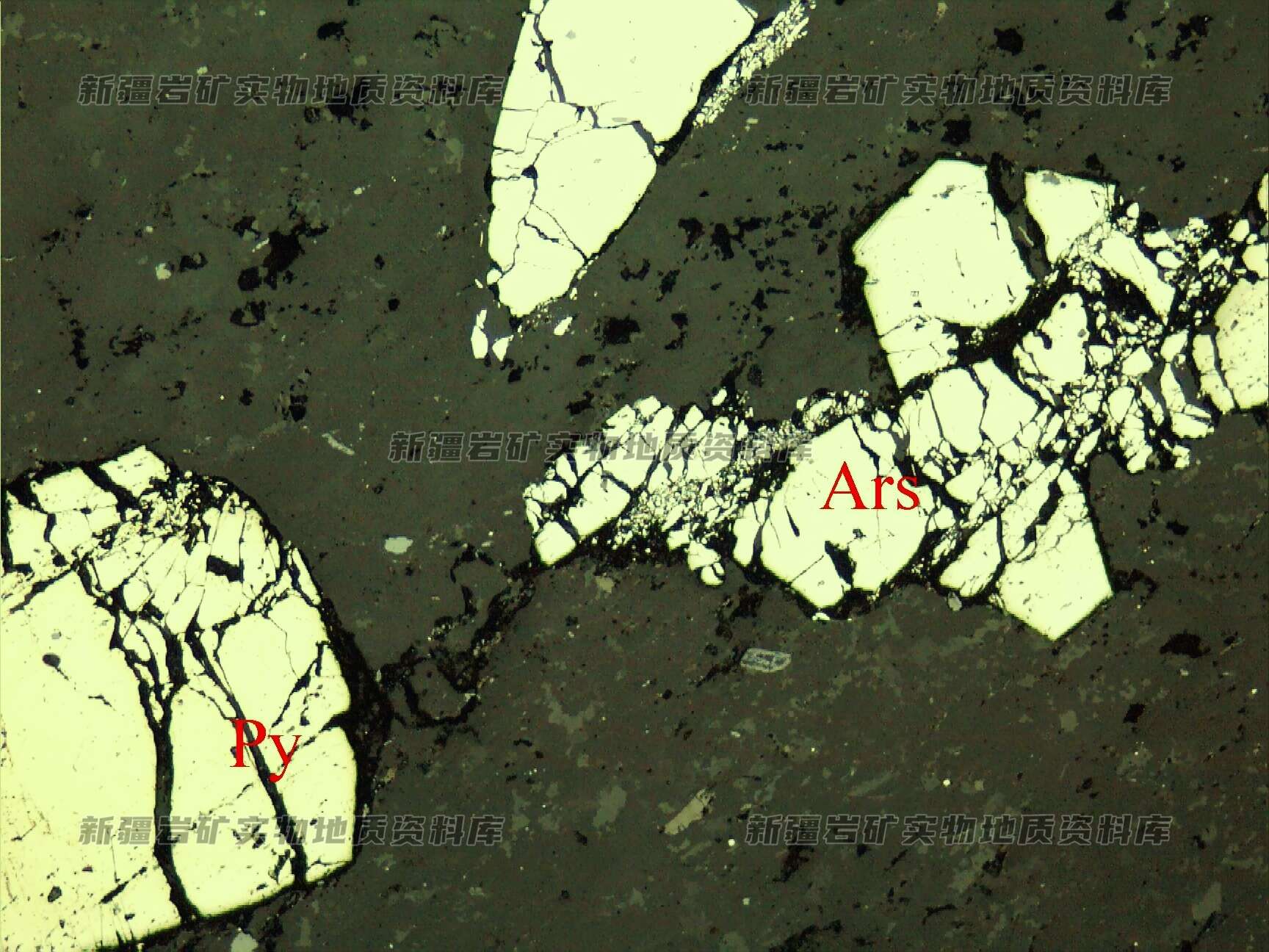 岩石特征描述: 金属硫化物黄铁矿(Py)、毒砂(Ars)呈自形-他形粒状,受应力活动影响,被压碎呈碎粒状集合体分布。