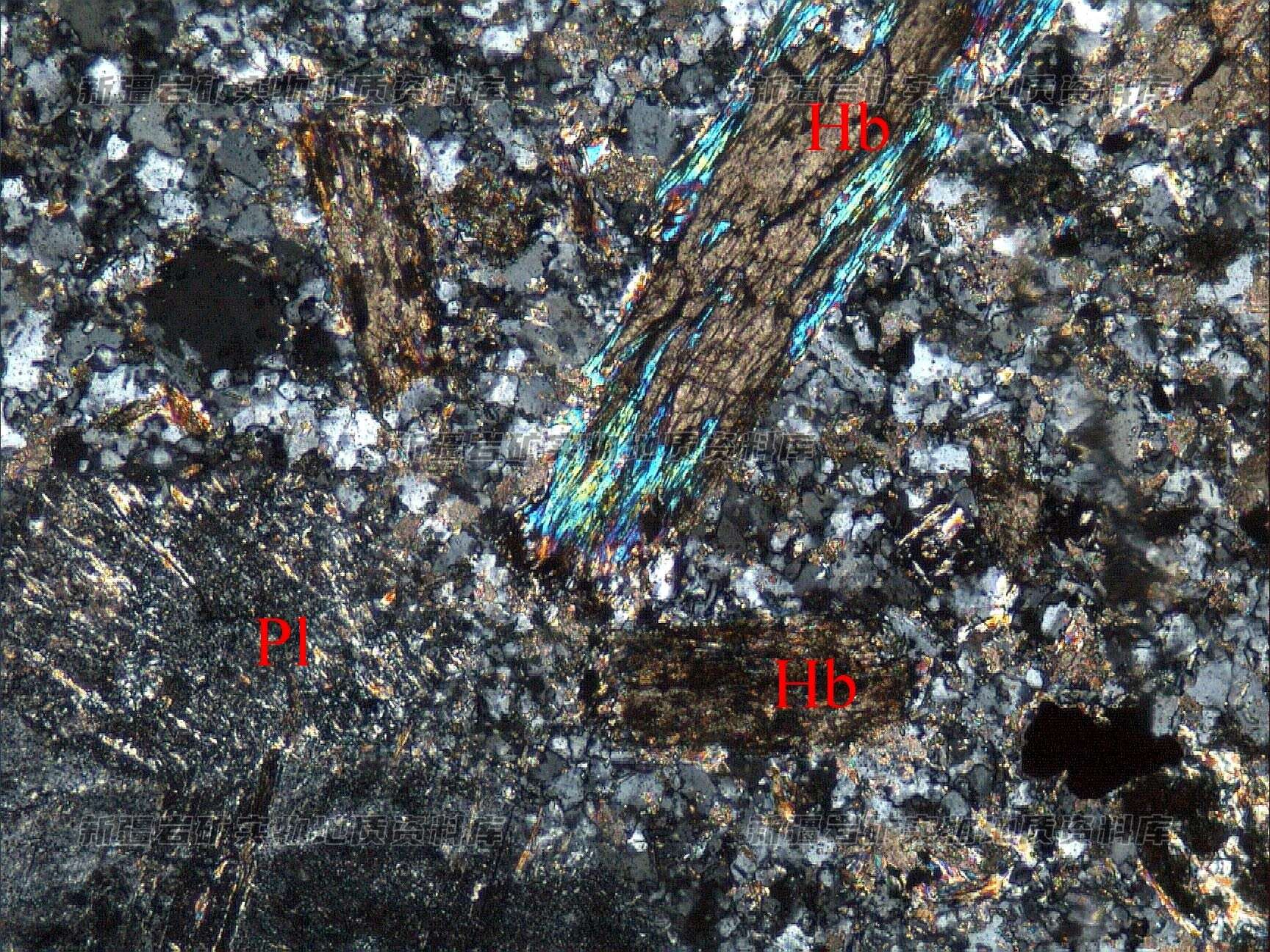 岩石特征描述: 斑状结构,基质具细粒结构。斑晶由斜长石(Pl)、角闪石(Hb)、石英,角闪石已变为方解石和白云母,基质由细粒斜长石、石英集合体构成。