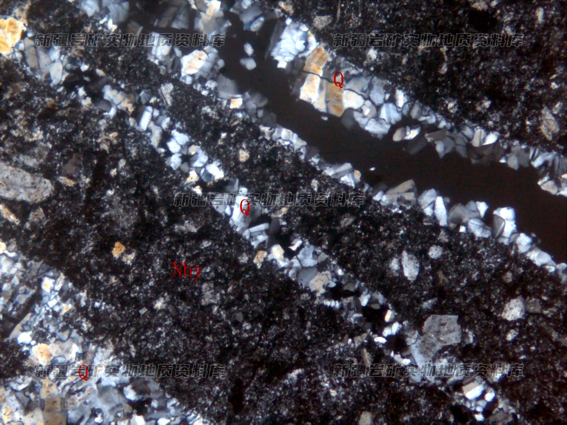 岩石特征描述: 在凝灰岩(Nhy)张性裂隙中充填数条石英脉(Q)。
