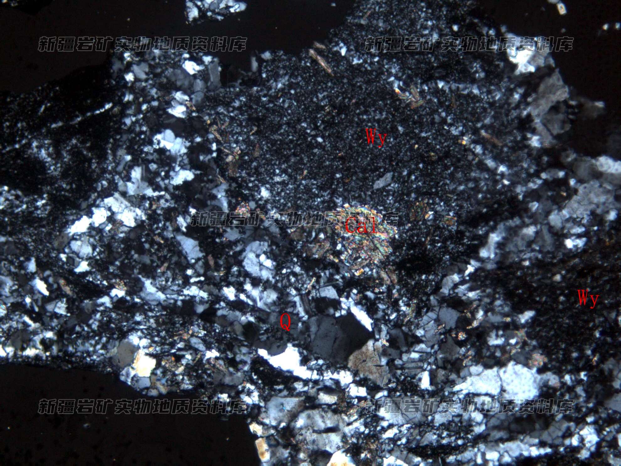 岩石特征描述: 原岩角砾(Wy)被次生石英(Q)及方解石(cal)交代,其原生矿物已消失呈阴影状分布。