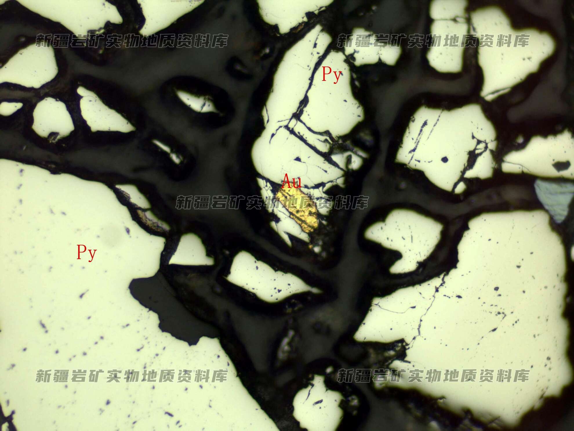自然金(Au)沿黄铁矿(Py)粒间分布,形态呈长粒状。