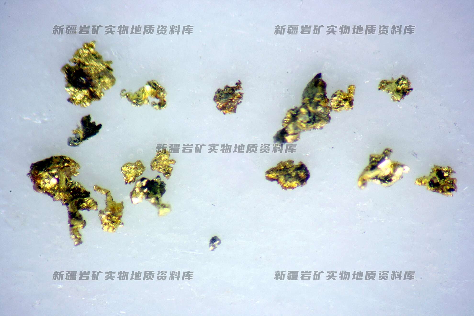 自然金呈金黄色,多呈多角状、不规则粒状分布。