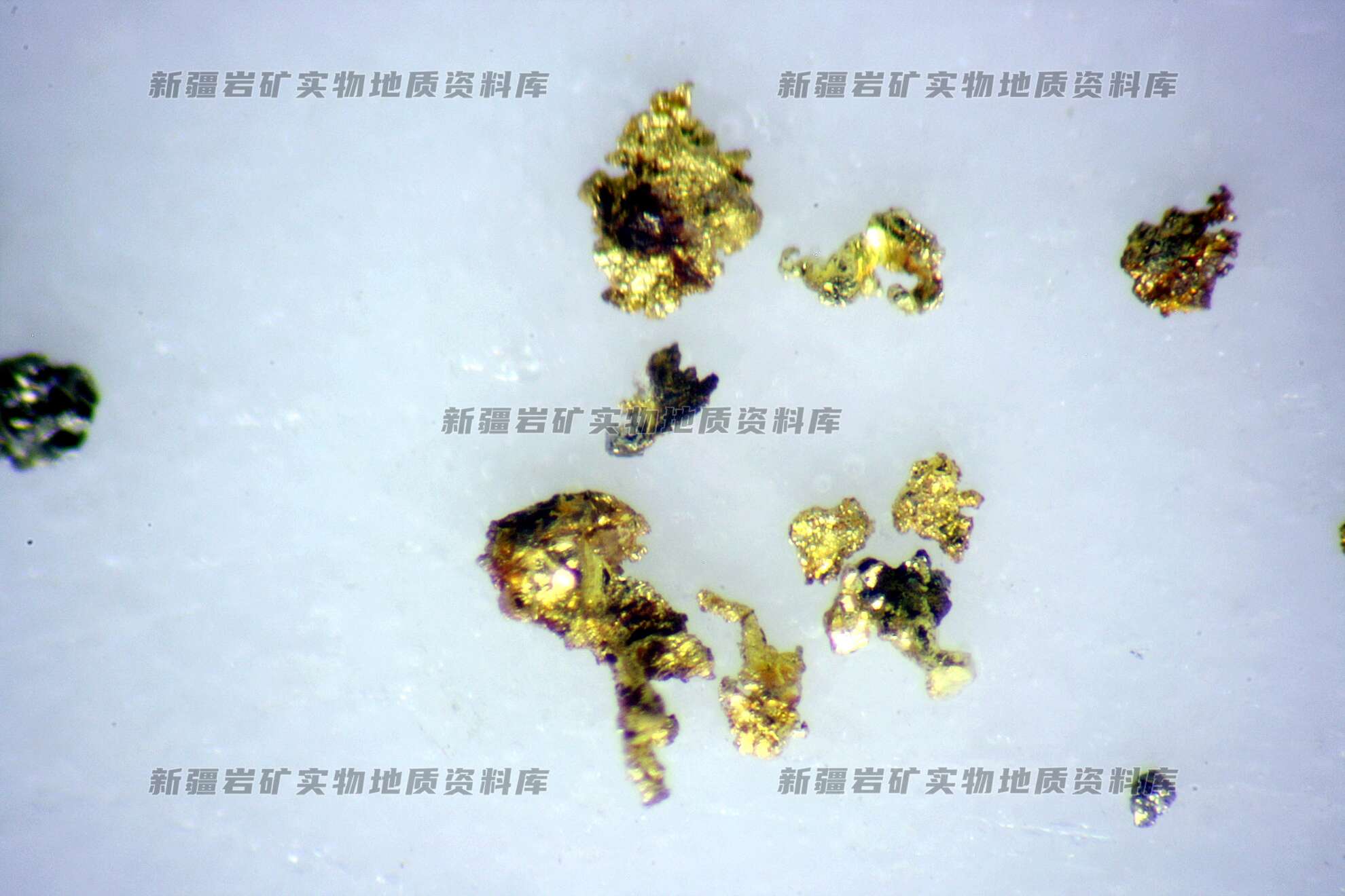 自然金呈金黄色,多呈多角状、不规则粒状分布。