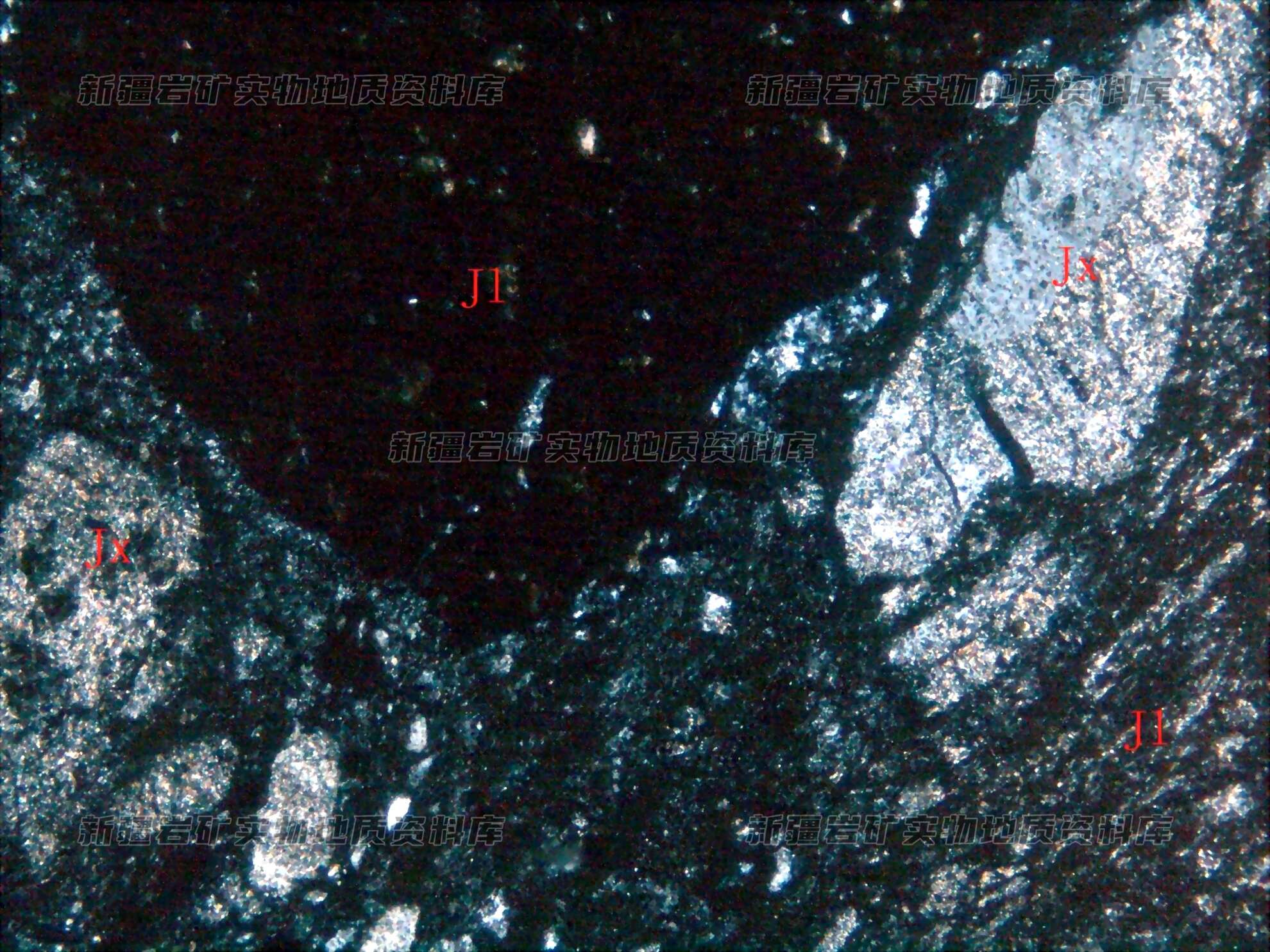 岩石特征描述: 岩石由火山角砾(Jl)、岩屑、晶屑(Jx)及胶结物构成,长石被绢云母交代。