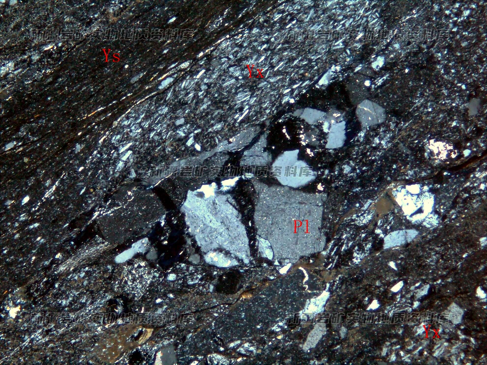 岩石特征描述: 岩石主要由长石(Fb)、岩屑(Yx)砾石及胶结物(Jj)构成,胶结物为受构造应力作用影响,产生压碎带(Ys)。