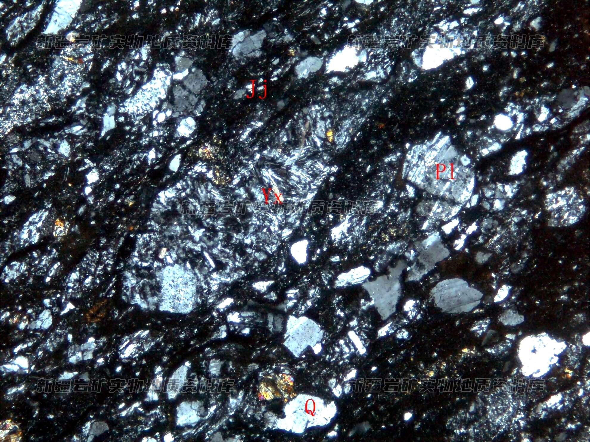 岩石特征描述: 岩石主要由长石(Fb)、石英(Q)、岩屑(Yx)及胶结物(Jj)构成