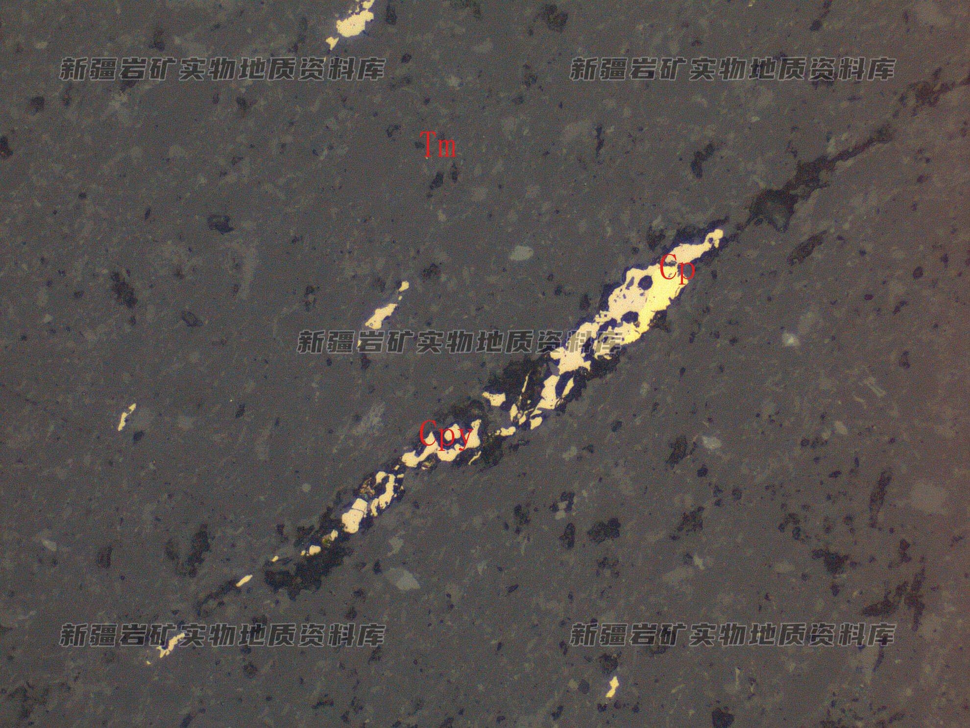 岩石特征描述: 金属硫化物为磁黄铁矿(Pyr)和黄铜矿(Cp),他形粒状,分布在透明矿物(Tm)粒间或裂隙中。